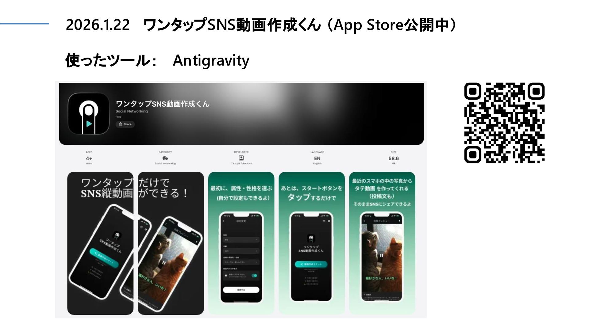 2026.1.22 ワンタップSNS動画作成くん (App Store公開中) 使ったツール: Antigravity