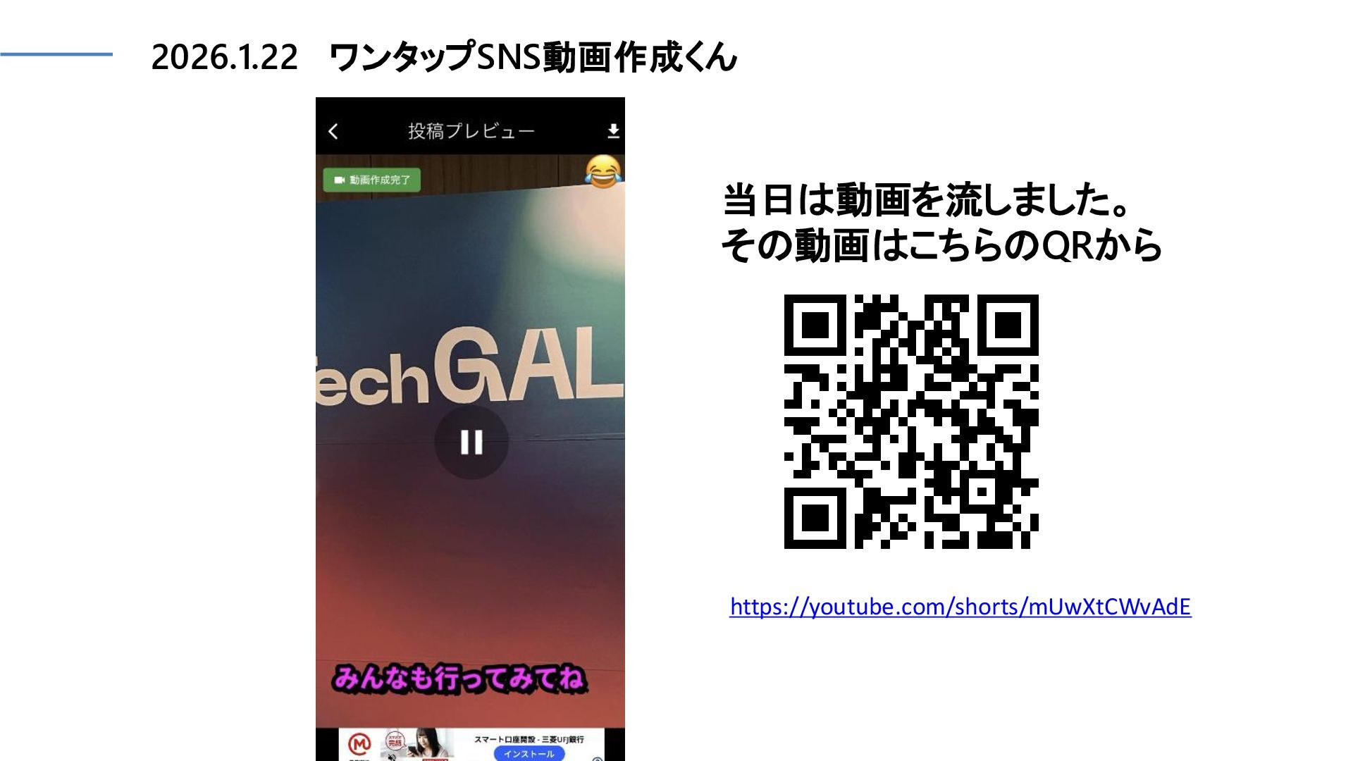 2026.1.22 ワンタップSNS動画作成くん 当日は動画を流しました。 その動画はこちらのQRから https://youtube.com/shorts/mUwXtCWvAdE