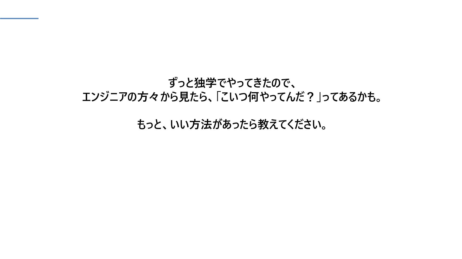 ずっと独学でやってきたので、 エンジニアの方々から見たら、「こいつ何やってんだ?」ってあるかも。 もっと、いい方法があったら教えてください。