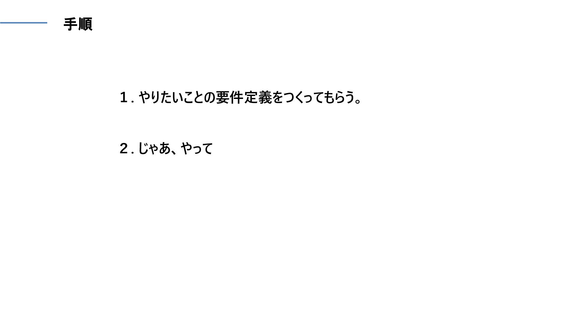 1. やりたいことの要件定義をつくってもらう。 2. じゃあ、やって 手順