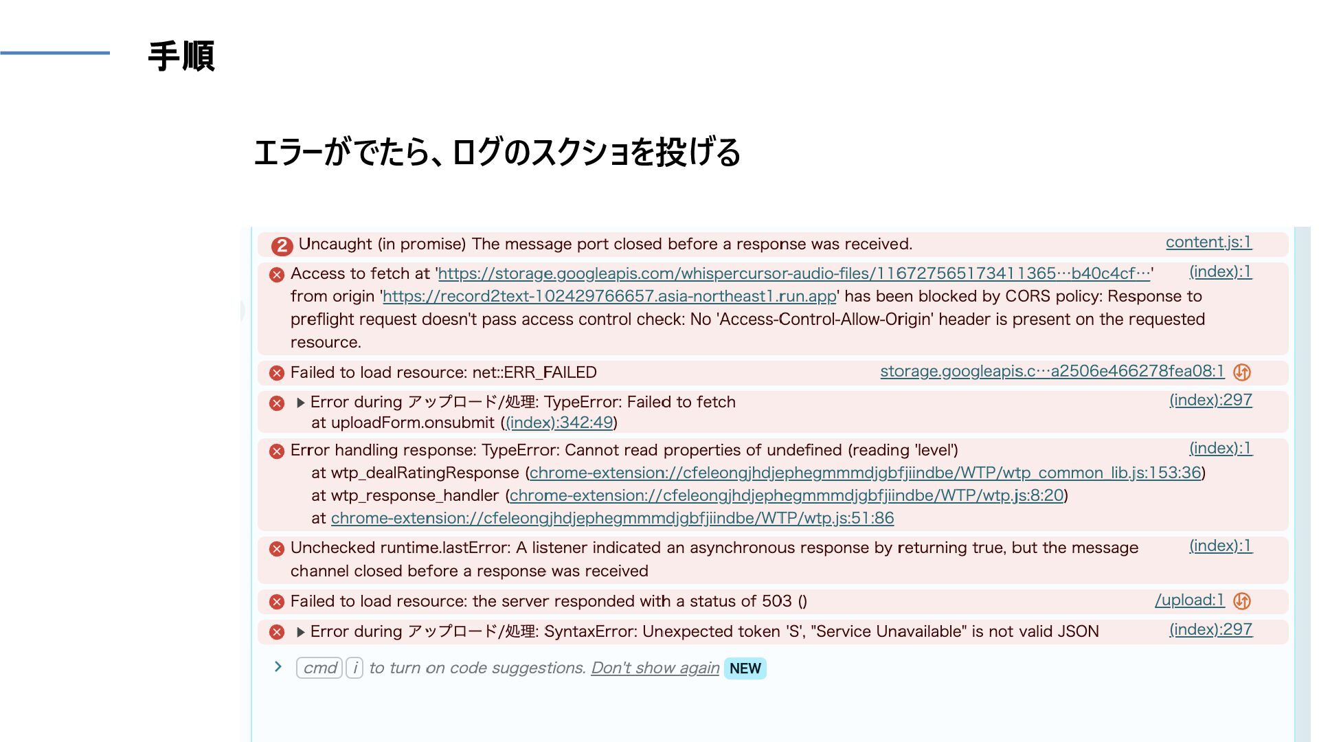 手順 エラーがでたら、ログのスクショを投げる