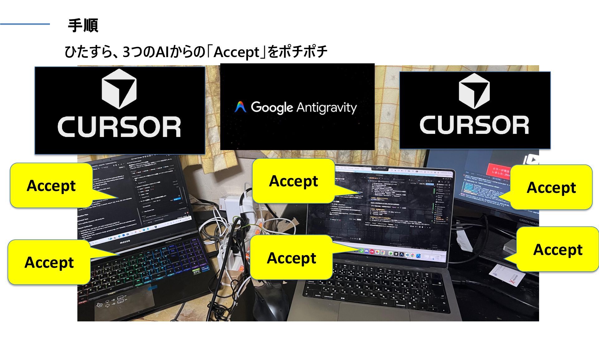 Accept Accept Accept Accept Accept Accept ひたすら、3つのAIからの「Accept」をポチポチ 手順