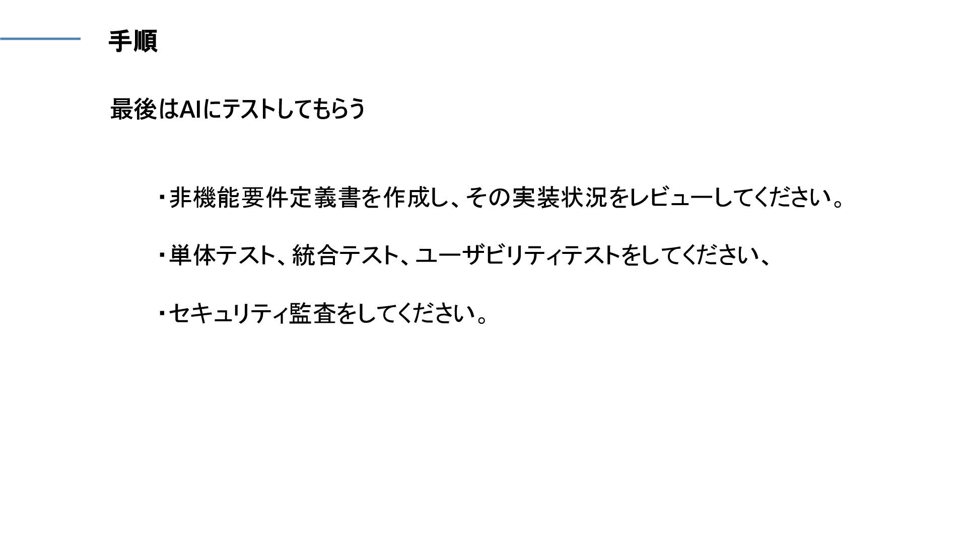 最後はAIにテストしてもらう ・非機能要件定義書を作成し、その実装状況をレビューしてください。 ・単体テスト、統合テスト、ユーザビリティテストをしてください、 ・セキュリティ監査をしてください。 手順