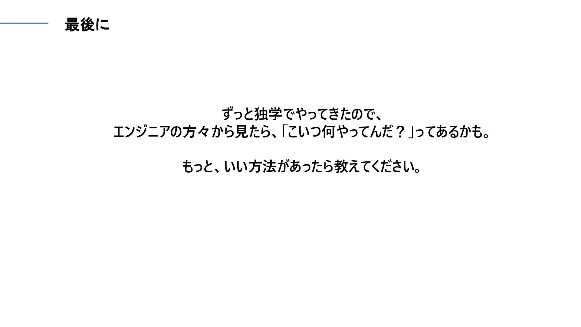 最後に ずっと独学でやってきたので、 エンジニアの方々から見たら、「こいつ何やってんだ?」ってあるかも。 もっと、いい方法があったら教えてください。