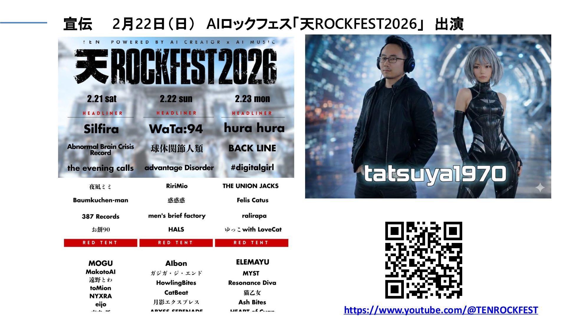 宣伝 2月22日(日) AIロックフェス「天ROCKFEST2026」 出演 https://www.youtube.com/@TENROCKFEST