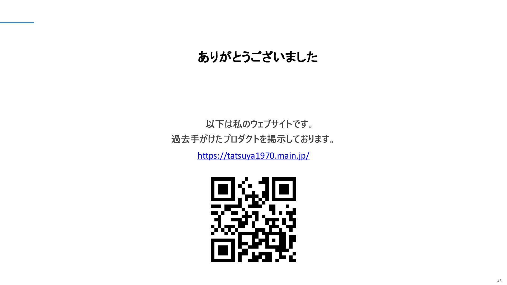 45 ありがとうございました https://tatsuya1970.main.jp/ 以下は私のウェブサイトです。 過去手がけたプロダクトを掲示しております。