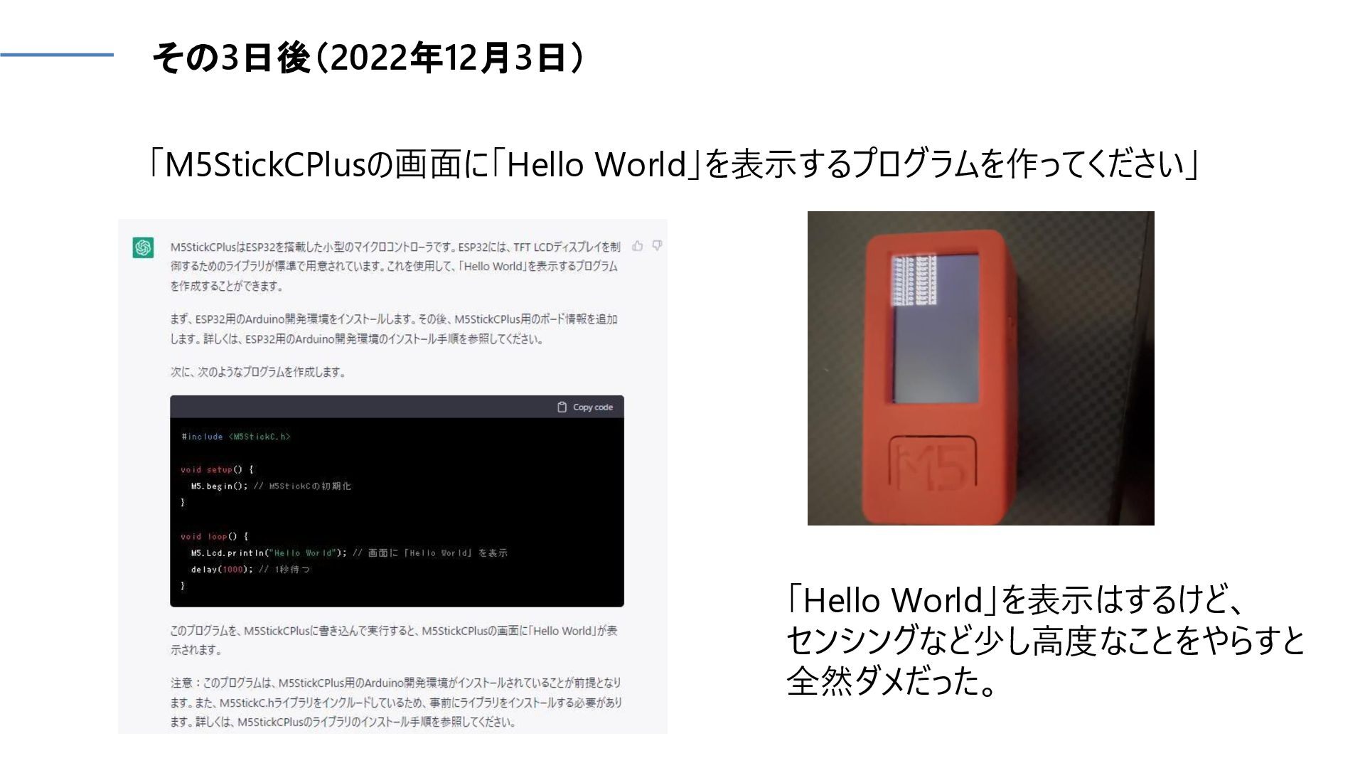 その3日後(2022年12月3日) 「Hello World」を表示はするけど、 センシングなど少し高度なことをやらすと 全然ダメだった。 「M5StickCPlusの画面に「Hello World」を表示するプログラムを作ってください」