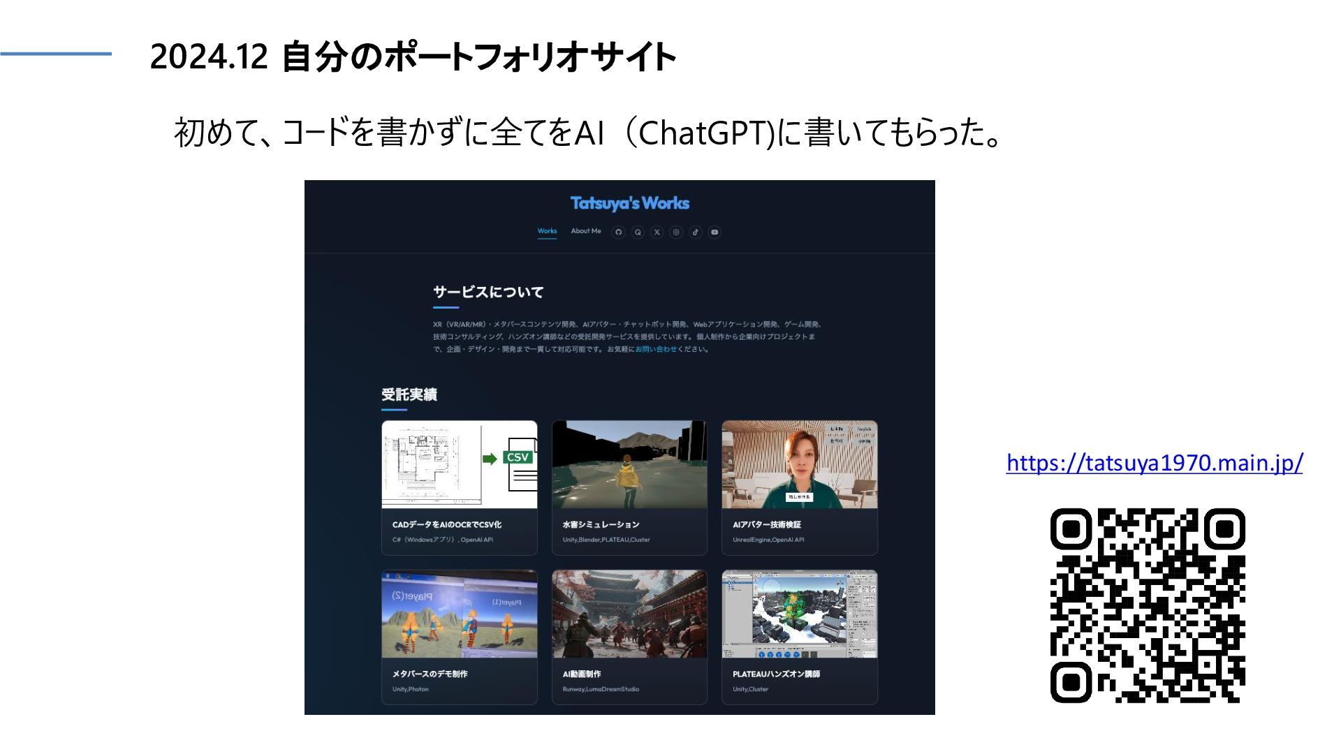2024.12 自分のポートフォリオサイト 初めて、コードを書かずに全てをAI(ChatGPT)に書いてもらった。 https://tatsuya1970.main.jp/