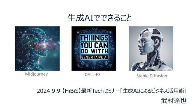 2024.9.9 【HiBiS】最新Techセミナー「⽣成AIによるビジネス活⽤術」 武村達也 Midjourney DALL-E3 Stable Diffusion ⽣成AIでできること