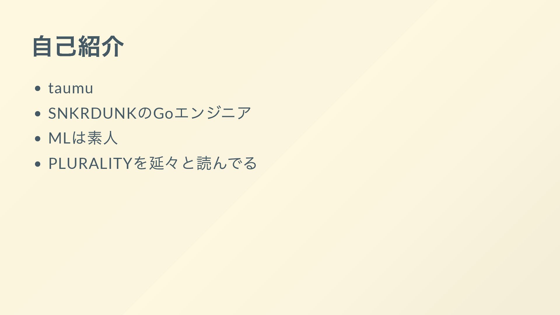 自己紹介 taumu SNKRDUNK のGo エンジニア ML は素人 PLURALITY を延々と読んでる