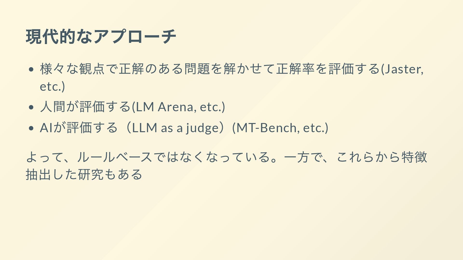 現代的なアプローチ 様々な観点で正解のある問題を解かせて正解率を評価する(Jaster, etc.) 人間が評価する(LM Arena, etc.) AI が評価する(LLM as a