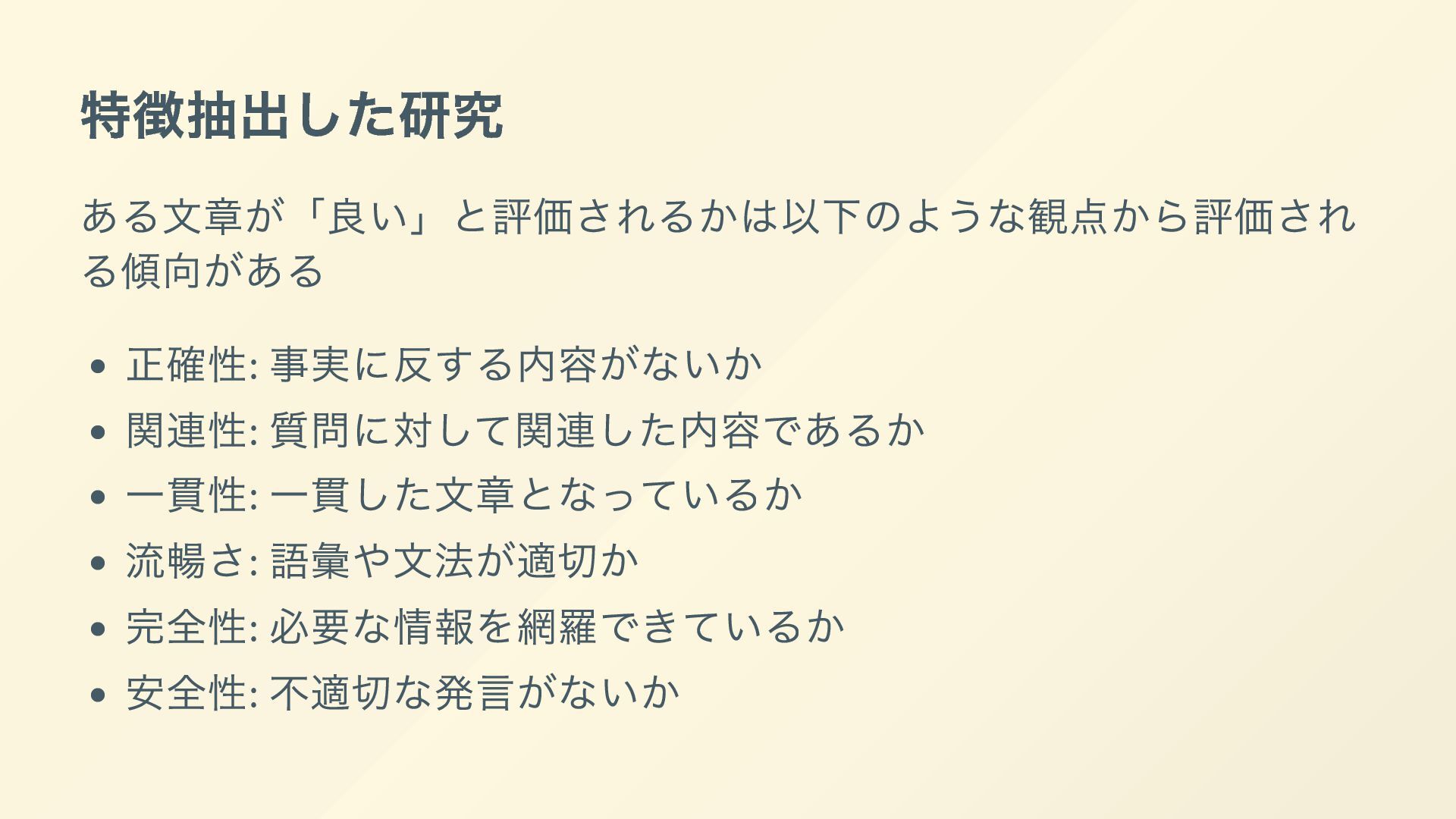 特徴抽出した研究 ある文章が「良い」と評価されるかは以下のような観点から評価され る傾向がある 正確性: 事実に反する内容がないか 関連性: 質問に対して関連した内容であるか 一貫性: 一貫した文章となっているか 流暢さ: