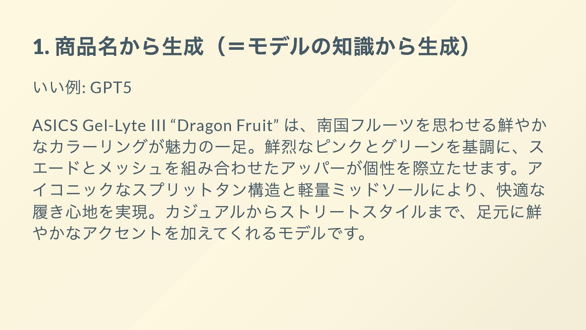 1. 商品名から生成(=モデルの知識から生成) いい例: GPT5 ASICS Gel-Lyte III “Dragon Fruit” は、南国フルーツを思わせる鮮やか