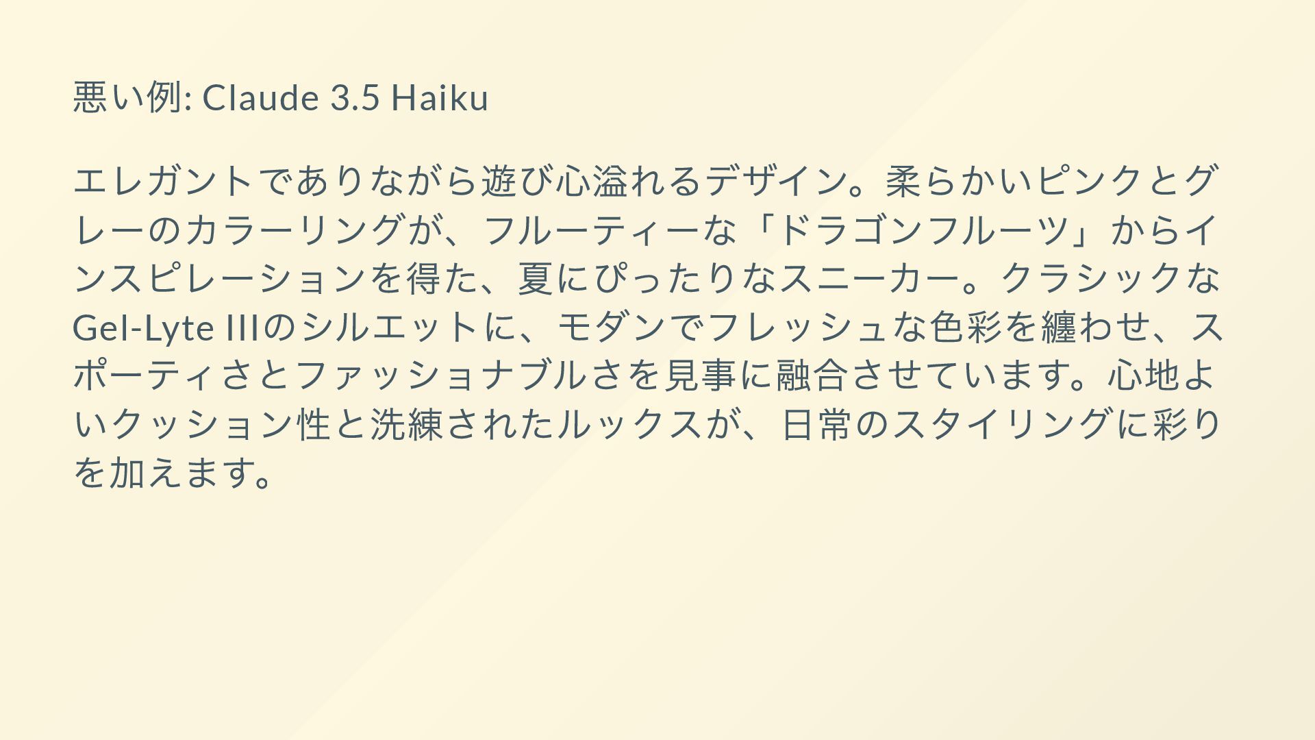 悪い例: Claude 3.5 Haiku エレガントでありながら遊び心溢れるデザイン。柔らかいピンクとグ レーのカラーリングが、フルーティーな「ドラゴンフルーツ」からイ ンスピレーションを得た、夏にぴったりなスニーカー。クラシックな Gel-Lyte III のシルエットに、モダンでフレッシュな色彩を纏わせ、ス