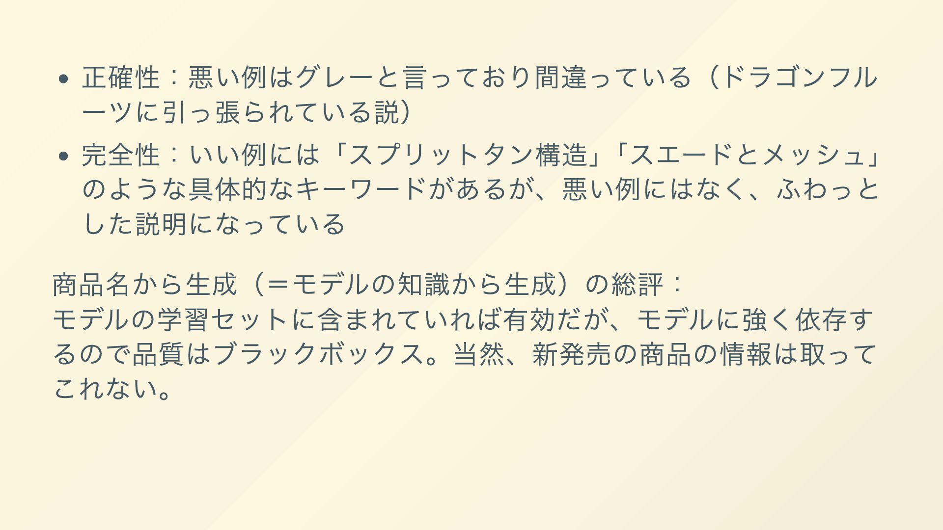 正確性:悪い例はグレーと言っており間違っている(ドラゴンフル ーツに引っ張られている説) 完全性:いい例には「スプリットタン構造」 「スエードとメッシュ」 のような具体的なキーワードがあるが、悪い例にはなく、ふわっと した説明になっている 商品名から生成(=モデルの知識から生成)の総評: モデルの学習セットに含まれていれば有効だが、モデルに強く依存す るので品質はブラックボックス。当然、新発売の商品の情報は取って これない。