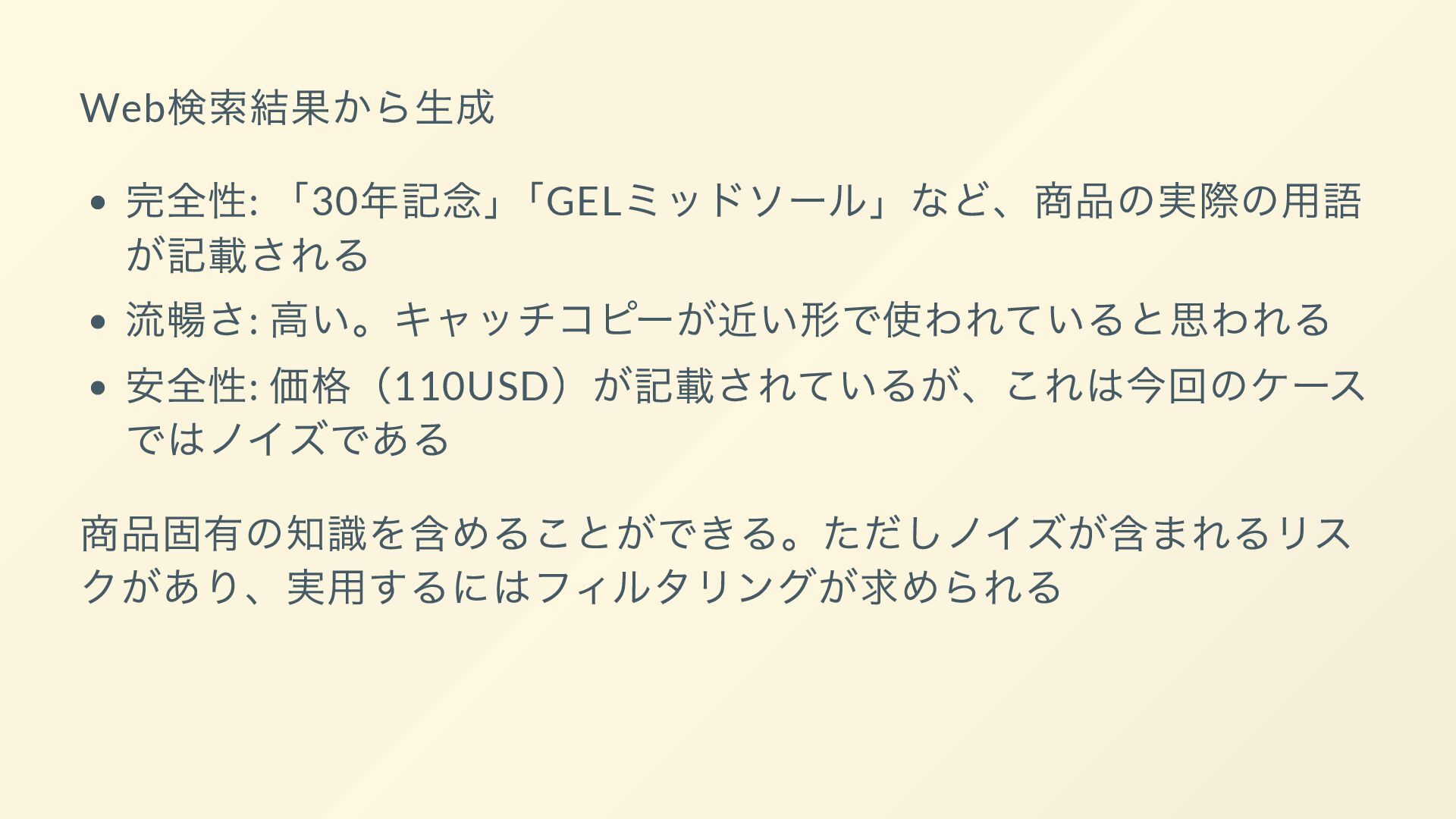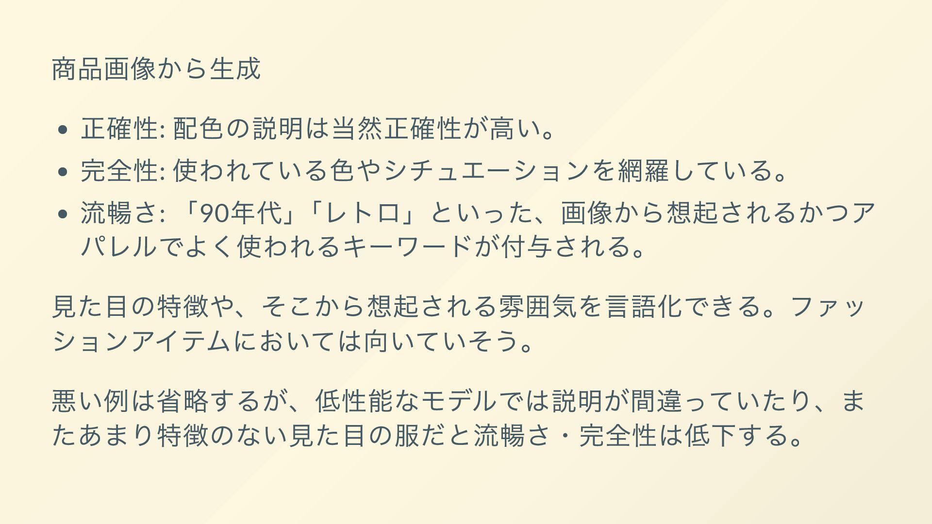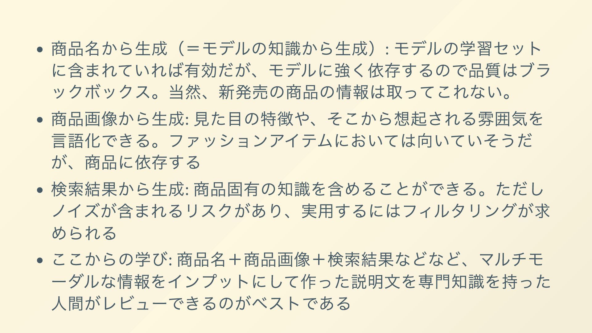 商品名から生成(=モデルの知識から生成): モデルの学習セット に含まれていれば有効だが、モデルに強く依存するので品質はブラ ックボックス。当然、新発売の商品の情報は取ってこれない。 商品画像から生成: 見た目の特徴や、そこから想起される雰囲気を 言語化できる。ファッションアイテムにおいては向いていそうだ が、商品に依存する 検索結果から生成: 商品固有の知識を含めることができる。ただし