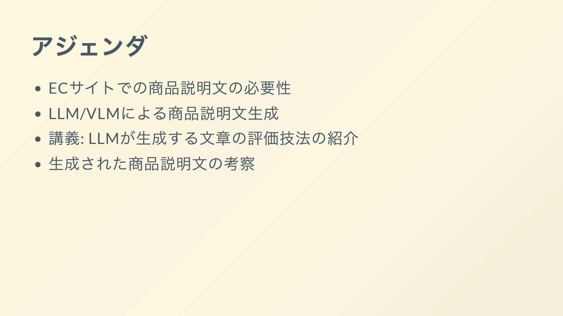 アジェンダ EC サイトでの商品説明文の必要性 LLM/VLM による商品説明文生成 講義: LLM が生成する文章の評価技法の紹介 生成された商品説明文の考察