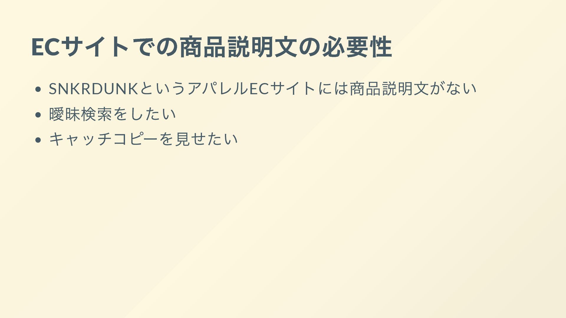 EC サイトでの商品説明文の必要性 SNKRDUNK というアパレルEC サイトには商品説明文がない 曖昧検索をしたい キャッチコピーを見せたい