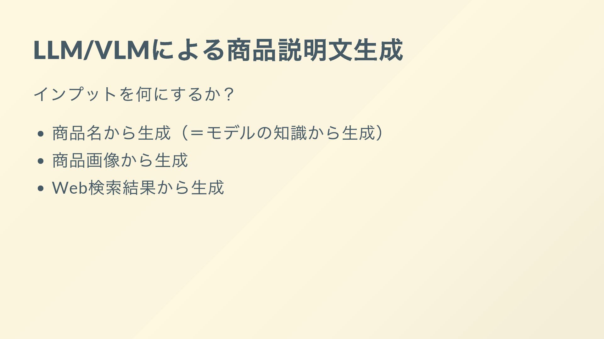 LLM/VLM による商品説明文生成 インプットを何にするか? 商品名から生成(=モデルの知識から生成) 商品画像から生成 Web 検索結果から生成