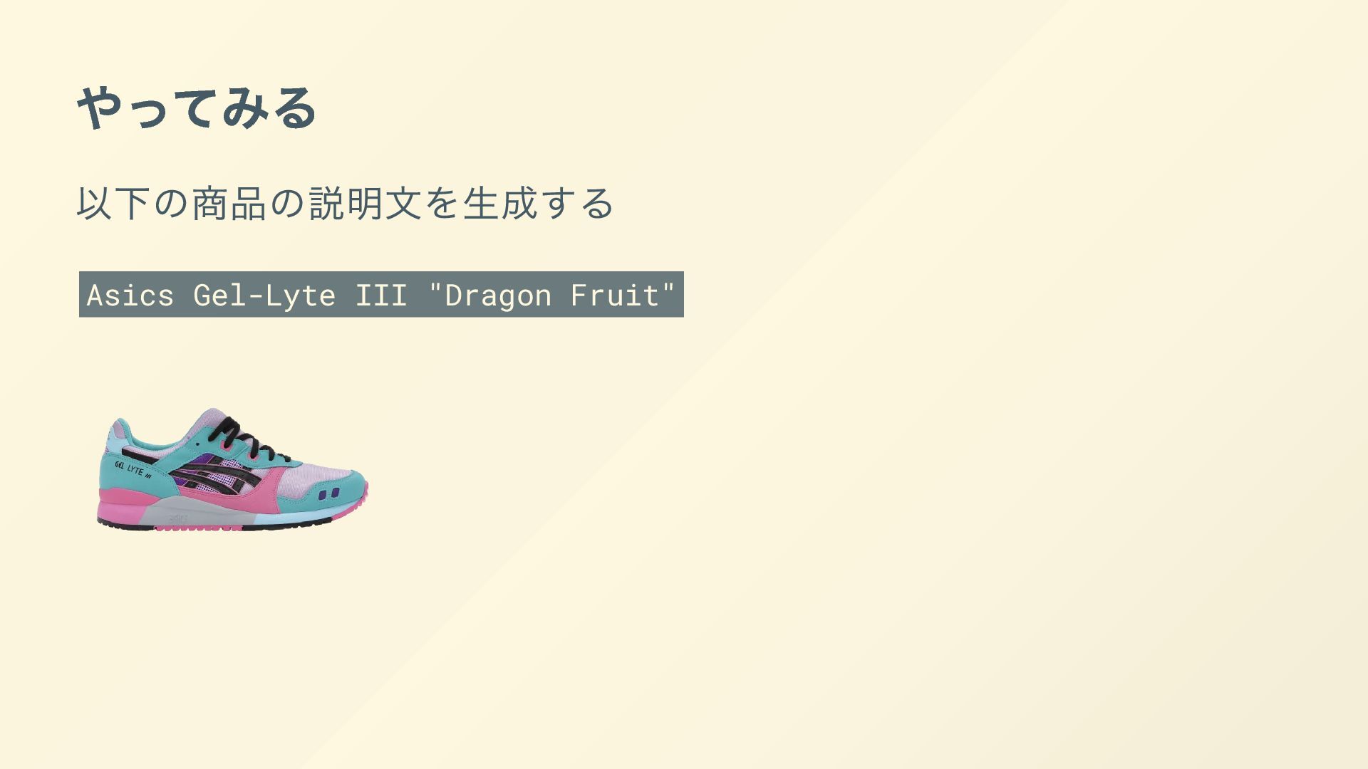 やってみる 以下の商品の説明文を生成する Asics Gel-Lyte III "Dragon Fruit"