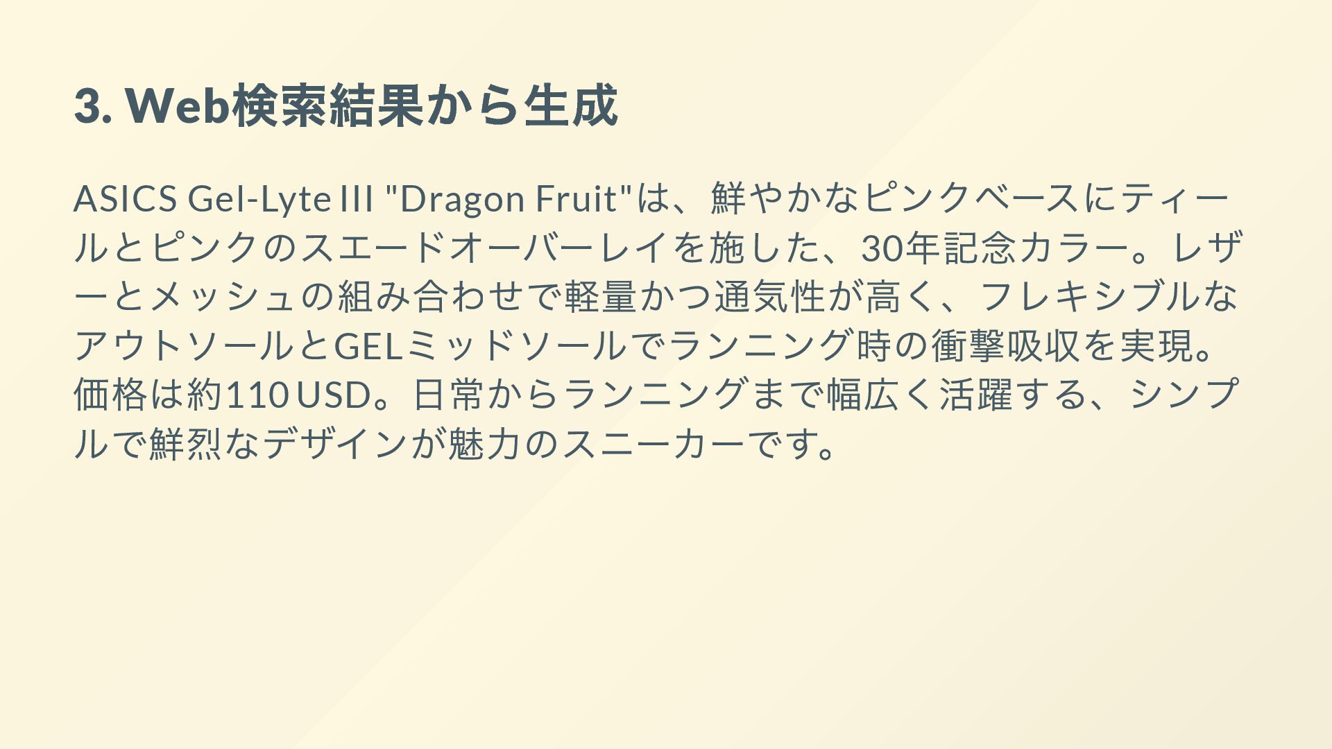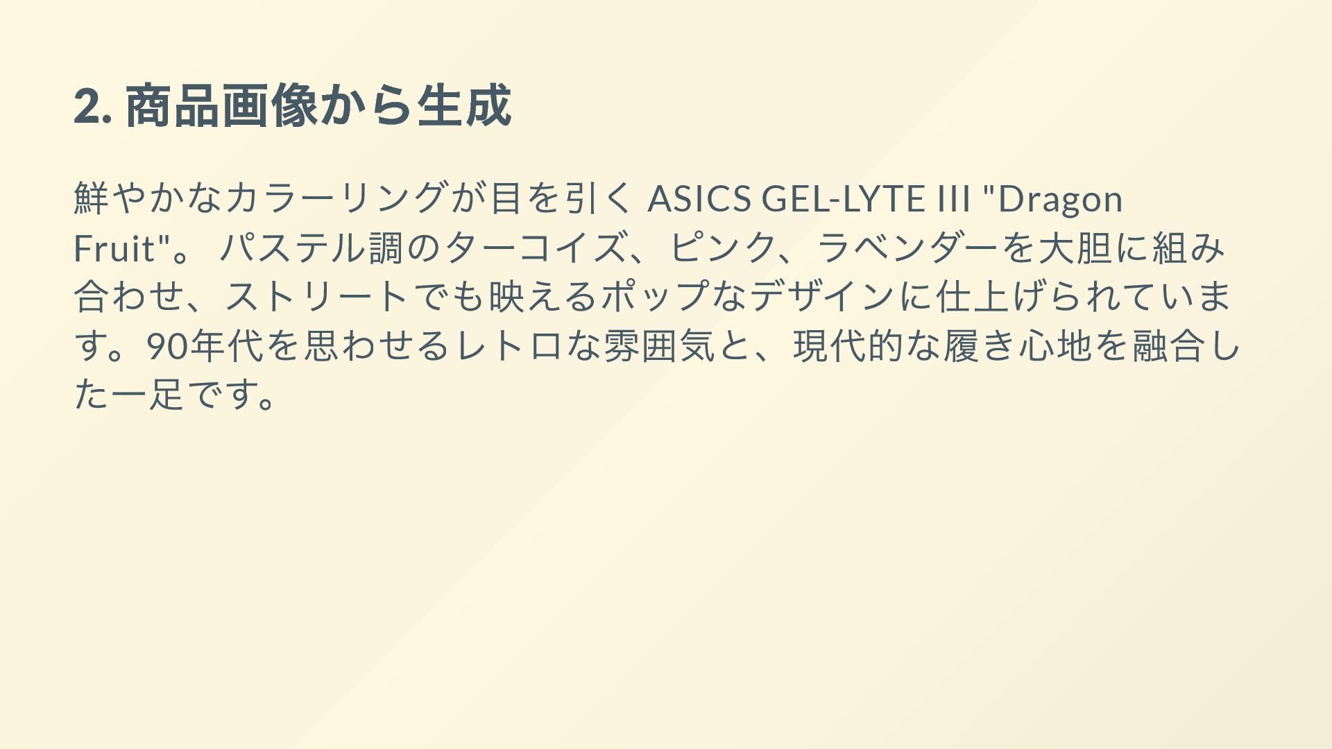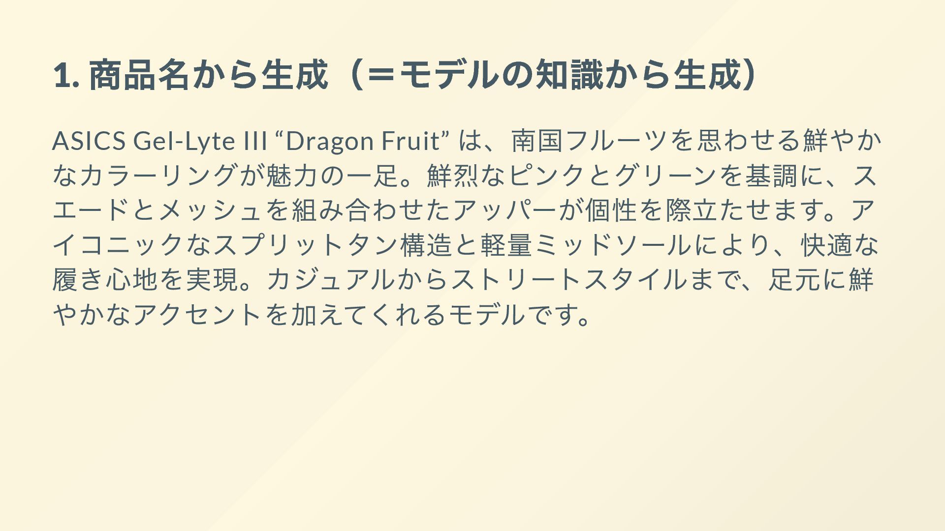 1. 商品名から生成(=モデルの知識から生成) ASICS Gel-Lyte III “Dragon Fruit” は、南国フルーツを思わせる鮮やか なカラーリングが魅力の一足。鮮烈なピンクとグリーンを基調に、ス エードとメッシュを組み合わせたアッパーが個性を際立たせます。ア
