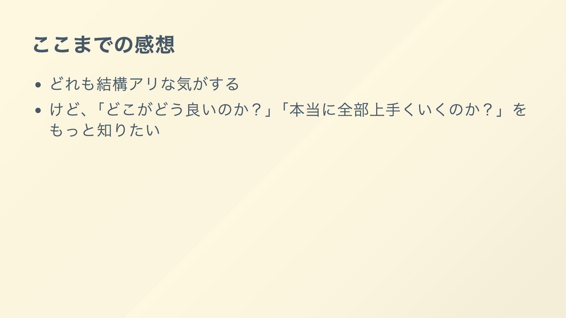 ここまでの感想 どれも結構アリな気がする けど、 「どこがどう良いのか?」 「本当に全部上手くいくのか?」を もっと知りたい