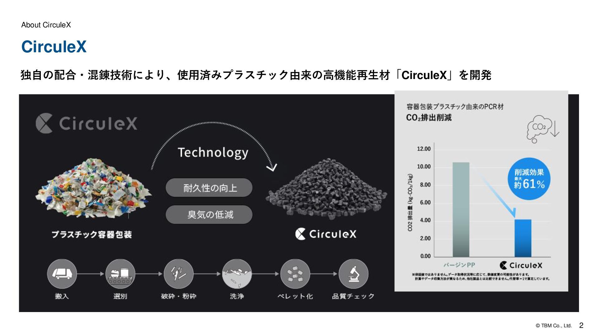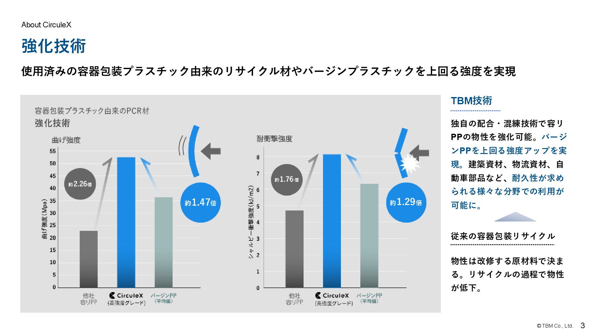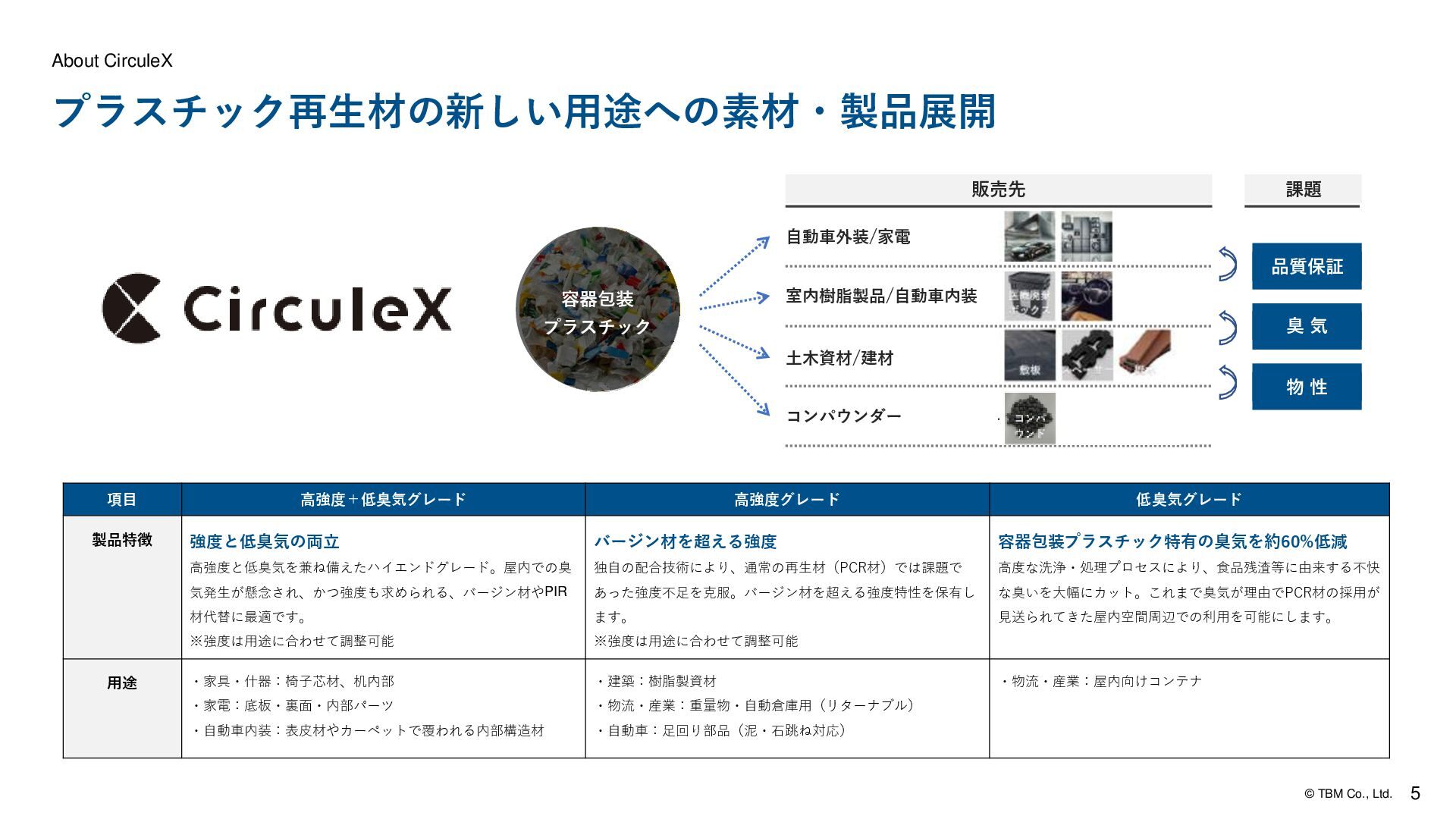高強度グレード 低臭気グレード 製品特徴 強度と低臭気の両立 高強度と低臭気を兼ね備えたハイエンドグレード。屋内での臭 気発生が懸念され、かつ強度も求められる、バージン材やPIR 材代替に最適です。 ※強度は用途に合わせて調整可能 バージン材を超える強度 独自の配合技術により、通常の再生材(PCR材)では課題で あった強度不足を克服。バージン材を超える強度特性を保有し ます。 ※強度は用途に合わせて調整可能 容器包装プラスチック特有の臭気を約60%低減 高度な洗浄・処理プロセスにより、食品残渣等に由来する不快 な臭いを大幅にカット。これまで臭気が理由でPCR材の採用が 見送られてきた屋内空間周辺での利用を可能にします。 用途 ・家具・什器:椅子芯材、机内部 ・家電:底板・裏面・内部パーツ ・自動車内装:表皮材やカーペットで覆われる内部構造材 ・建築:樹脂製資材 ・物流・産業:重量物・自動倉庫用(リターナブル) ・自動車:足回り部品(泥・石跳ね対応) ・物流・産業:屋内向けコンテナ 容器包装 プラスチック 販売先 自動車外装/家電 室内樹脂製品/自動車内装 土木資材/建材 コンパウンダー 物 性 臭 気 品質保証 課題