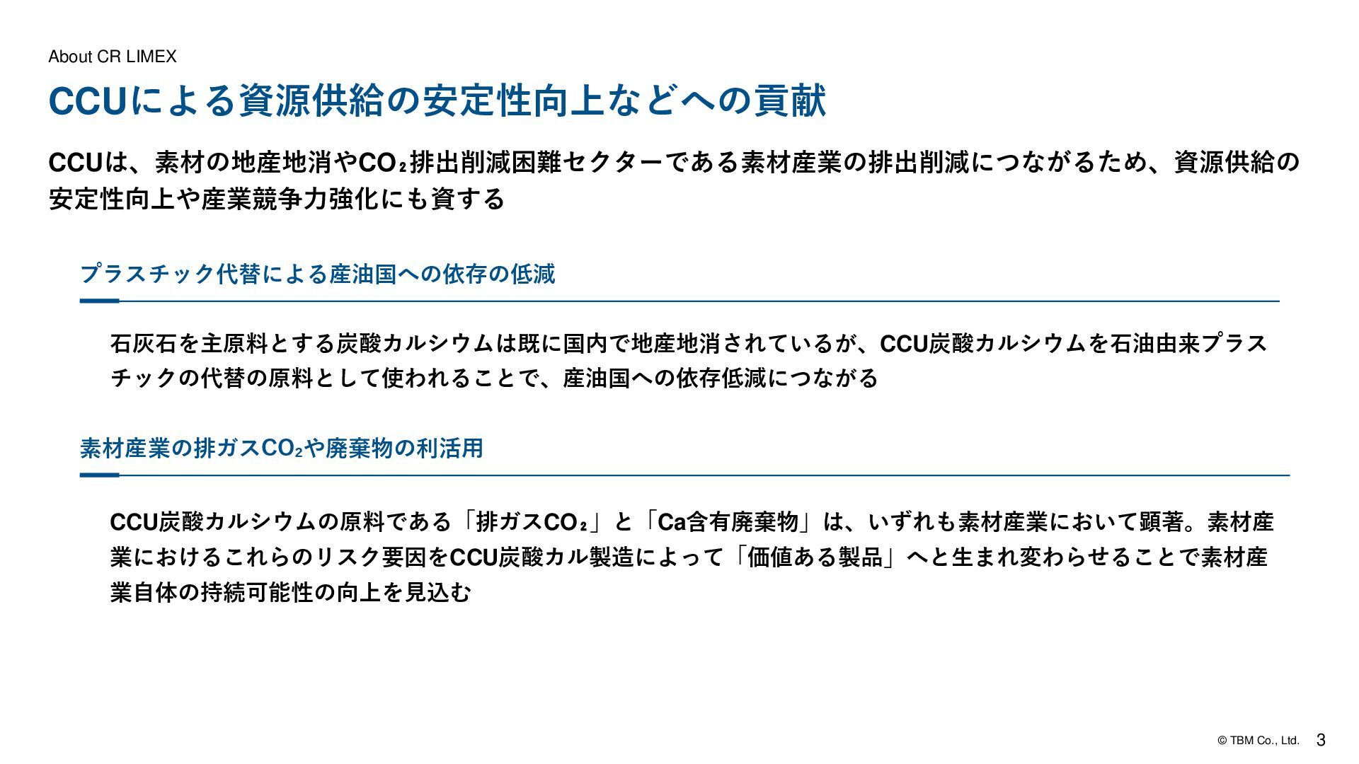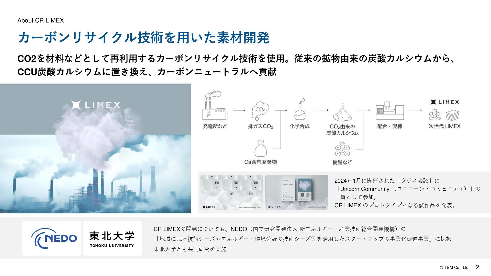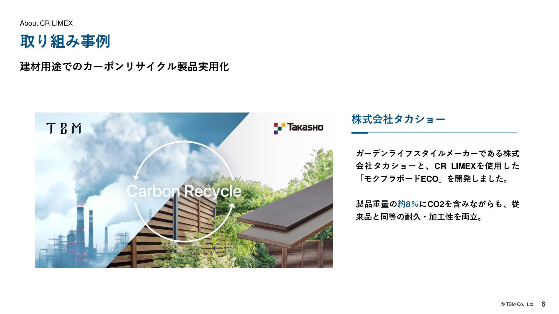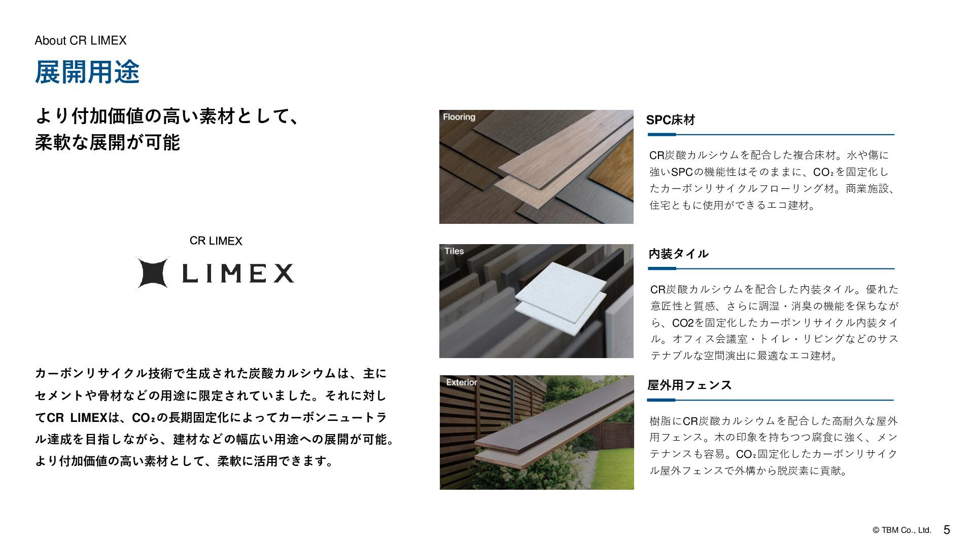 内装タイル CR炭酸カルシウムを配合した複合床材。水や傷に 強いSPCの機能性はそのままに、CO₂を固定化し たカーボンリサイクルフローリング材。商業施設、 住宅ともに使用ができるエコ建材。 CR炭酸カルシウムを配合した内装タイル。優れた 意匠性と質感、さらに調湿・消臭の機能を保ちなが ら、CO2を固定化したカーボンリサイクル内装タイ ル。オフィス会議室・トイレ・リビングなどのサス テナブルな空間演出に最適なエコ建材。 屋外用フェンス 樹脂にCR炭酸カルシウムを配合した高耐久な屋外 用フェンス。木の印象を持ちつつ腐食に強く、メン テナンスも容易。CO₂固定化したカーボンリサイク ル屋外フェンスで外構から脱炭素に貢献。 より付加価値の高い素材として、 柔軟な展開が可能 カーボンリサイクル技術で生成された炭酸カルシウムは、主に セメントや骨材などの用途に限定されていました。それに対し てCR LIMEXは、CO₂の長期固定化によってカーボンニュートラ ル達成を目指しながら、建材などの幅広い用途への展開が可能。 より付加価値の高い素材として、柔軟に活用できます。