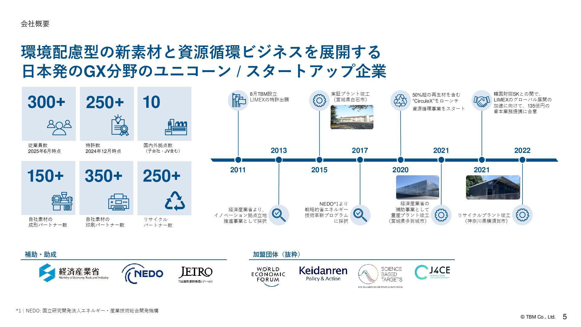 国立研究開発法人エネルギー・産業技術総合開発機構 補助・助成 会社概要 加盟団体(抜粋) 経済産業省より、 イノベーション拠点立地 推進事業として採択 8月TBM設立 LIMEXの特許出願 経済産業省の 補助事業として 量産プラント竣工 (宮城県多賀城市) 実証プラント竣工 (宮城県白石市) 50%超の再生材を含む “CirculeX”をローンチ 資源循環事業をスタート NEDO*1より 戦略的省エネルギー 技術革新プログラム に採択 リサイクルプラント竣工 (神奈川県横須賀市) 2013 2011 2021 2015 2017 2021 韓国財閥SKとの間で、 LIMEXのグローバル展開の 加速に向けて、135億円の 資本業務提携に合意 2020 2022 250+ 特許数 2024年12月時点 300+ 従業員数 2025年6月時点 10 国内外拠点数 (子会社・JV含む) 350+ 自社素材の 印刷パートナー数 150+ 自社素材の 成形パートナー数 250+ リサイクル パートナー数