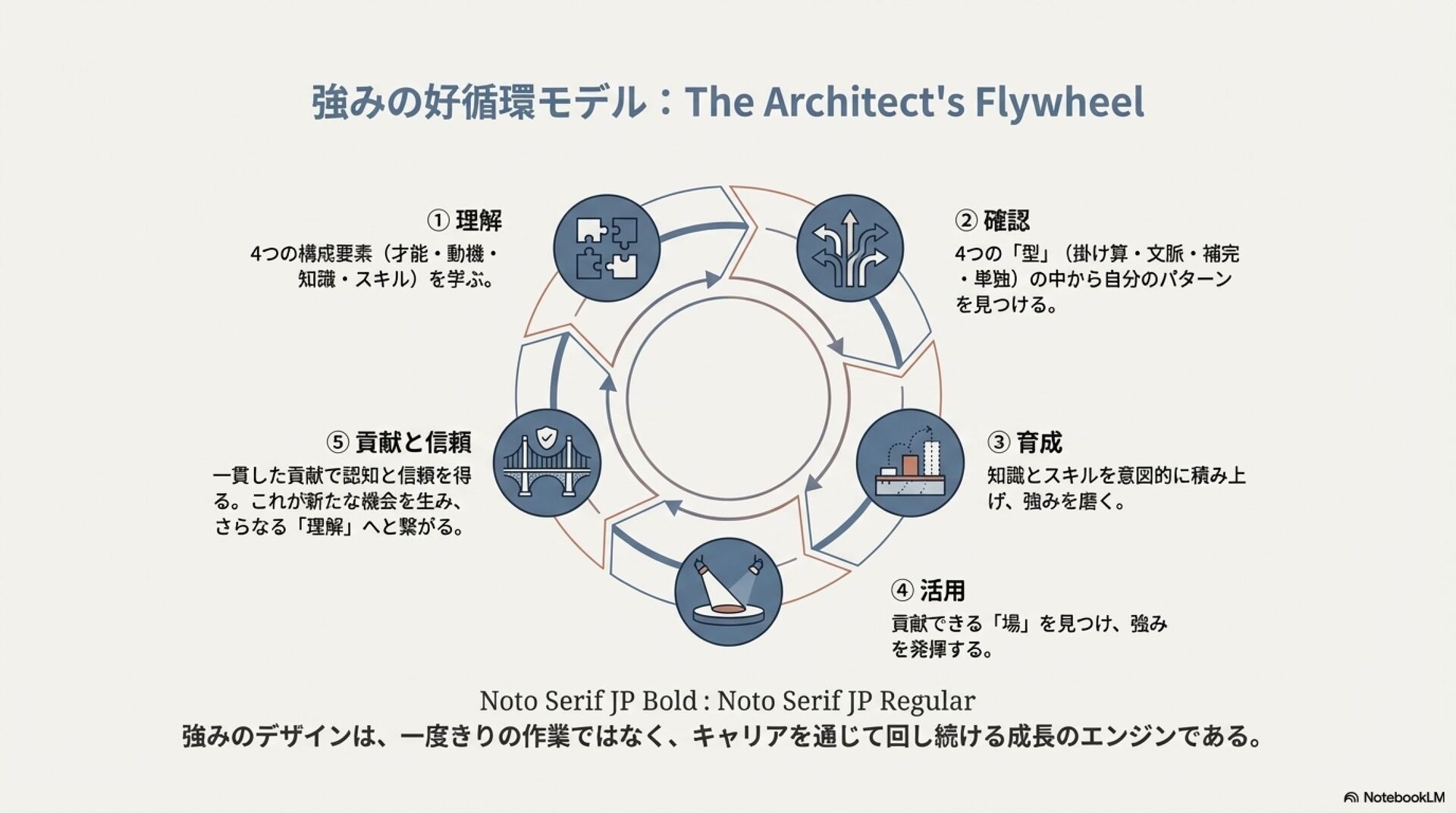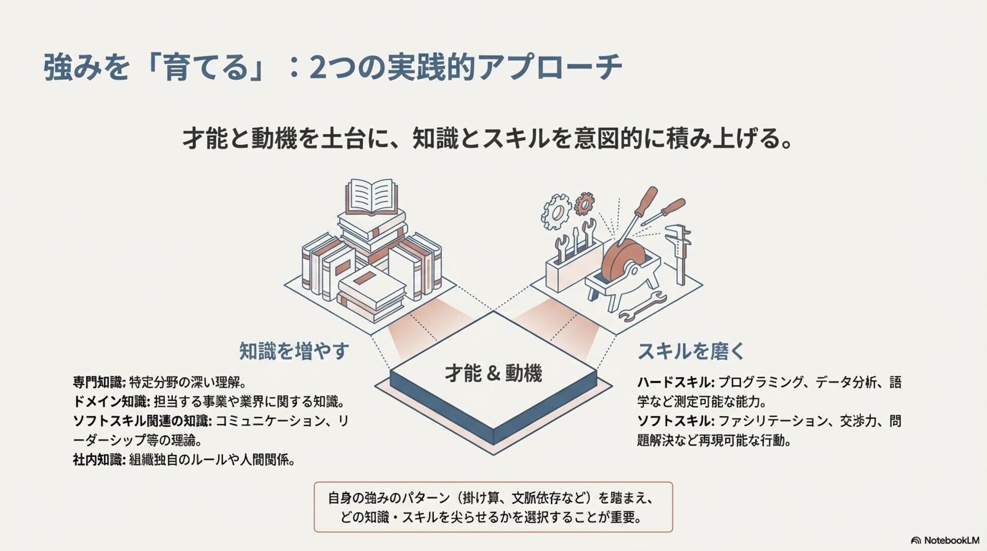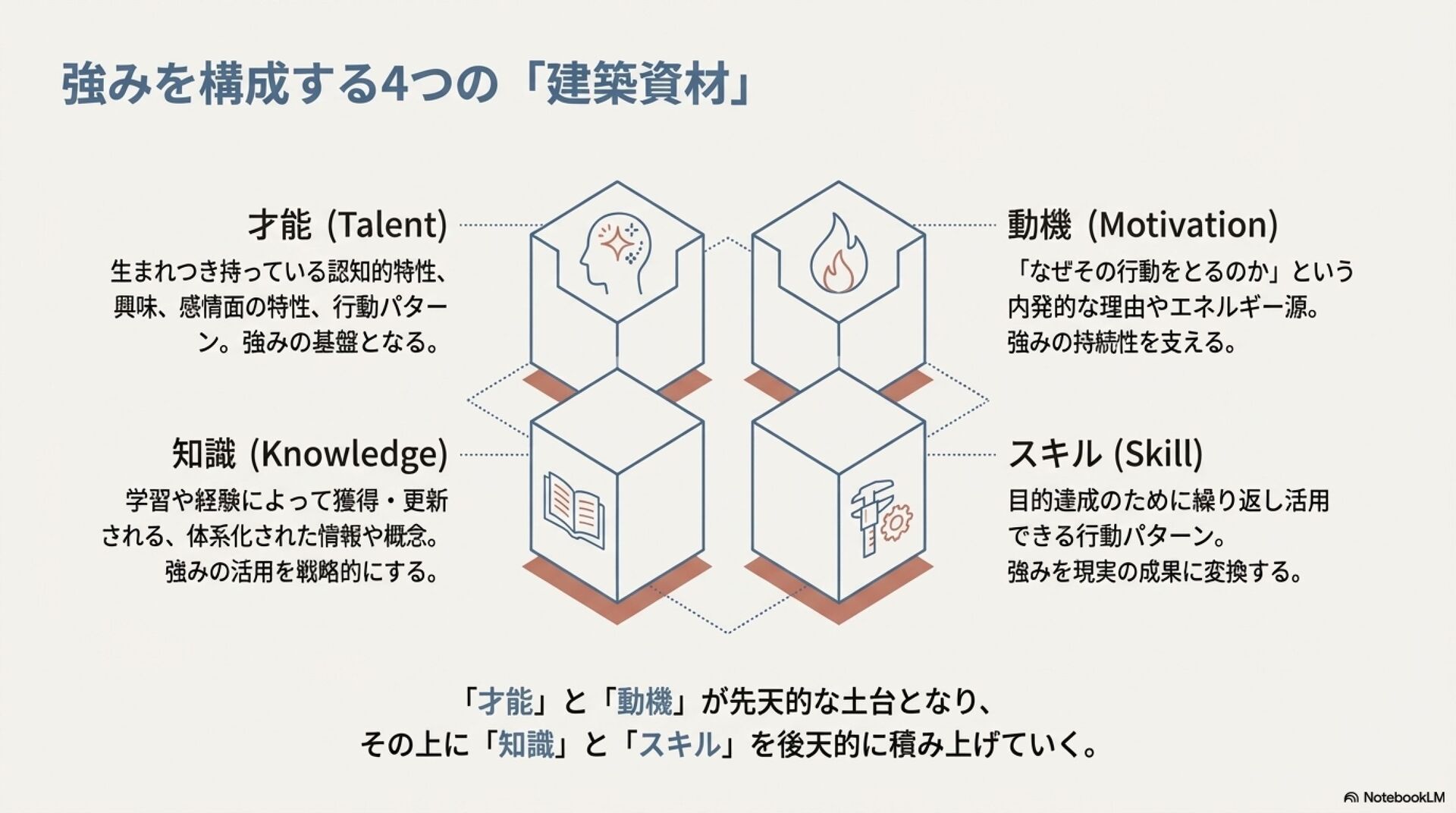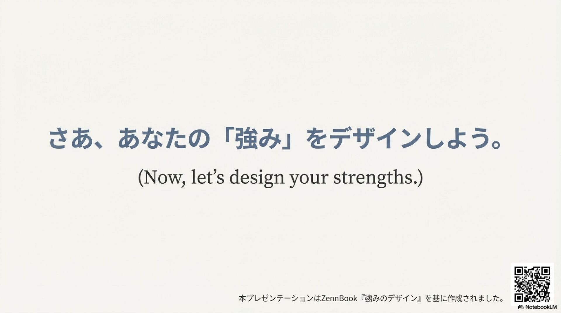 強みのデザイン入門 ZennBook ( https://zenn.dev/tbpgr/books/ee0950b3394ce0 )の内容を NotebookLM でスライドにしました。