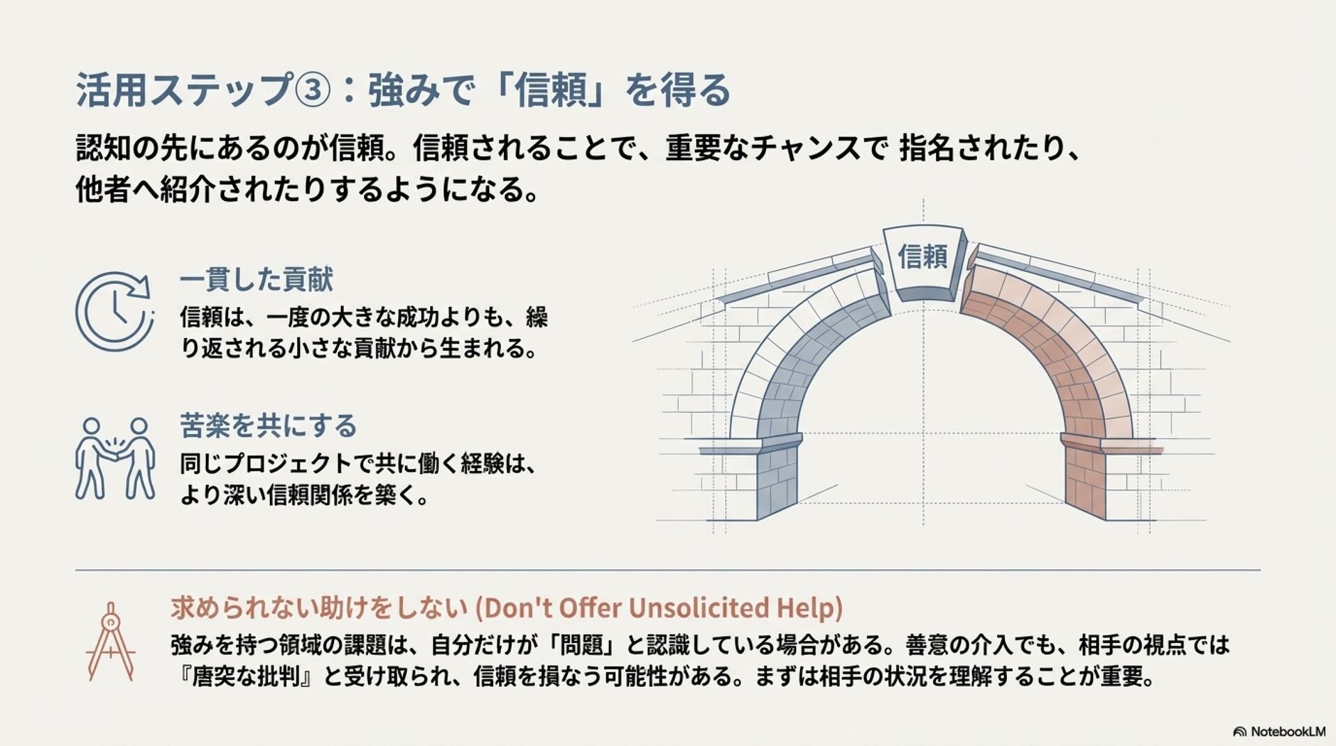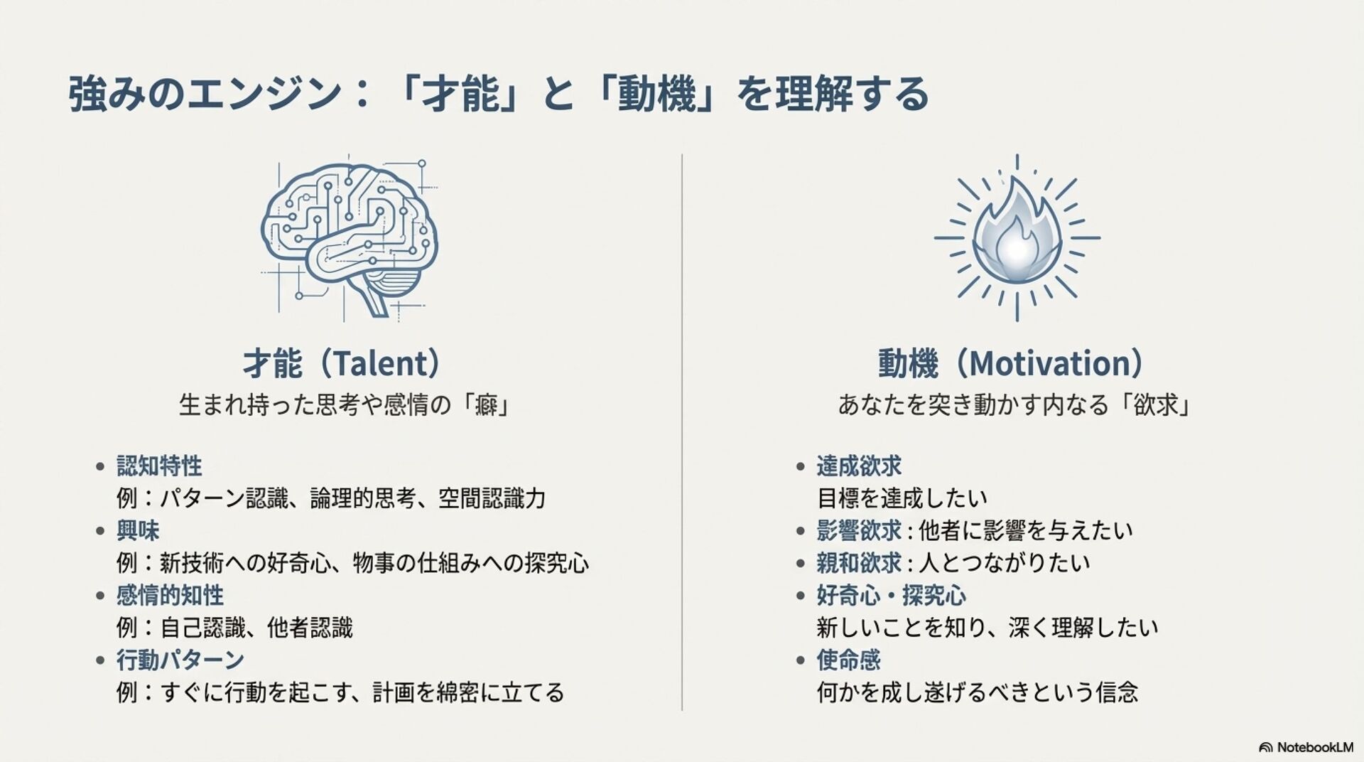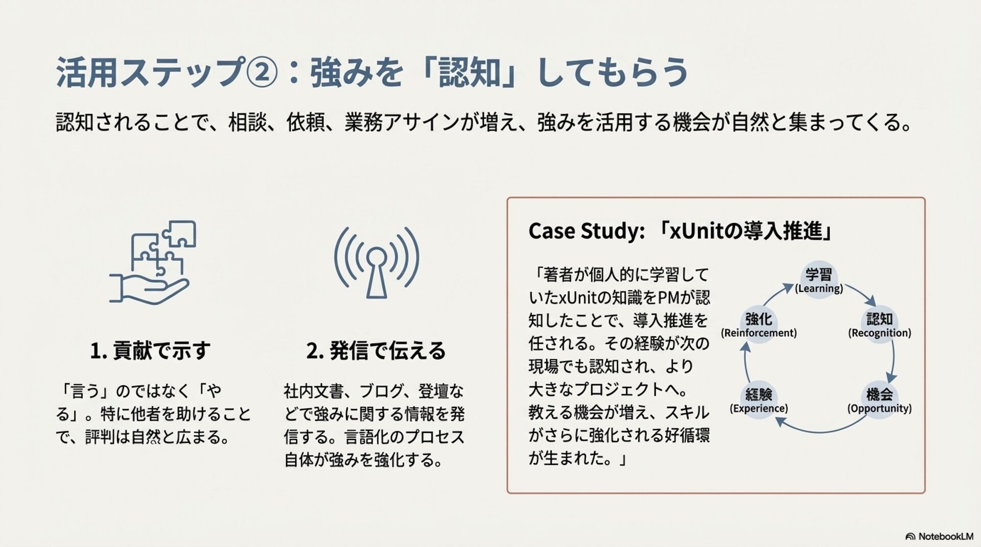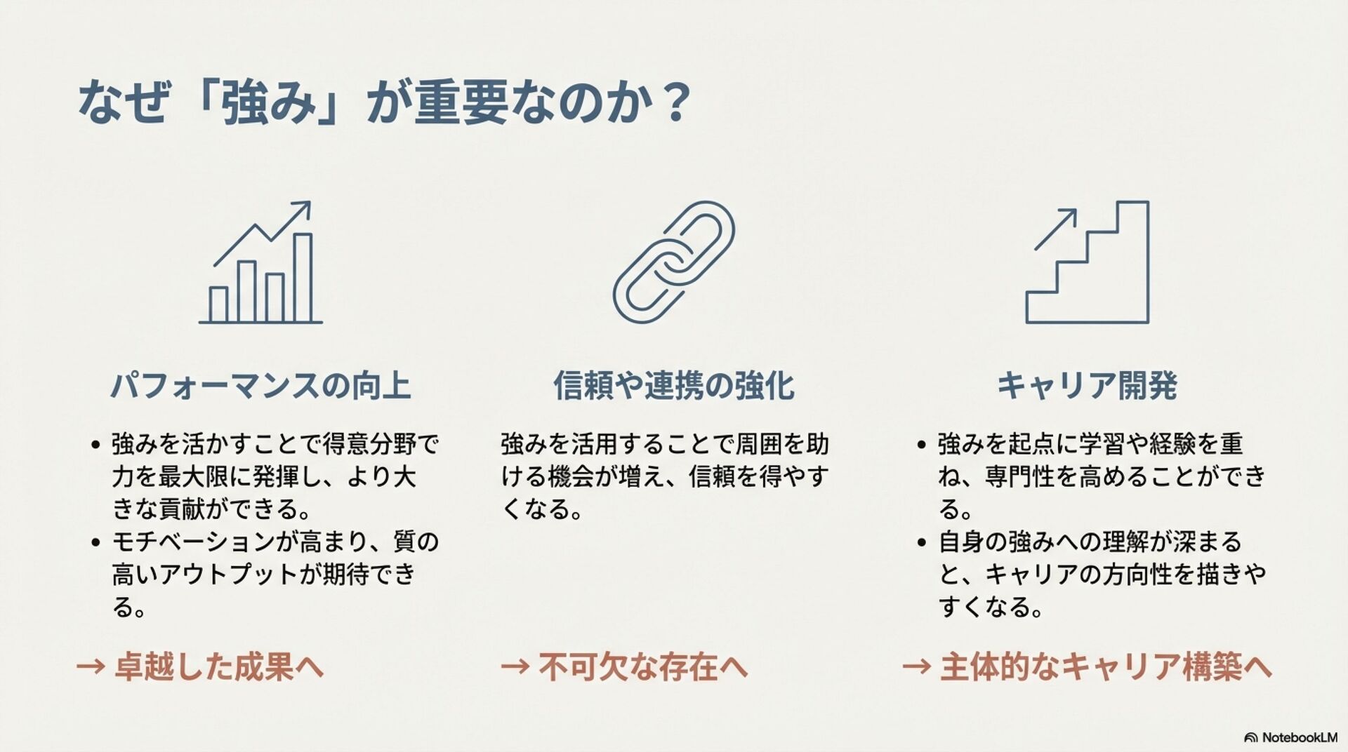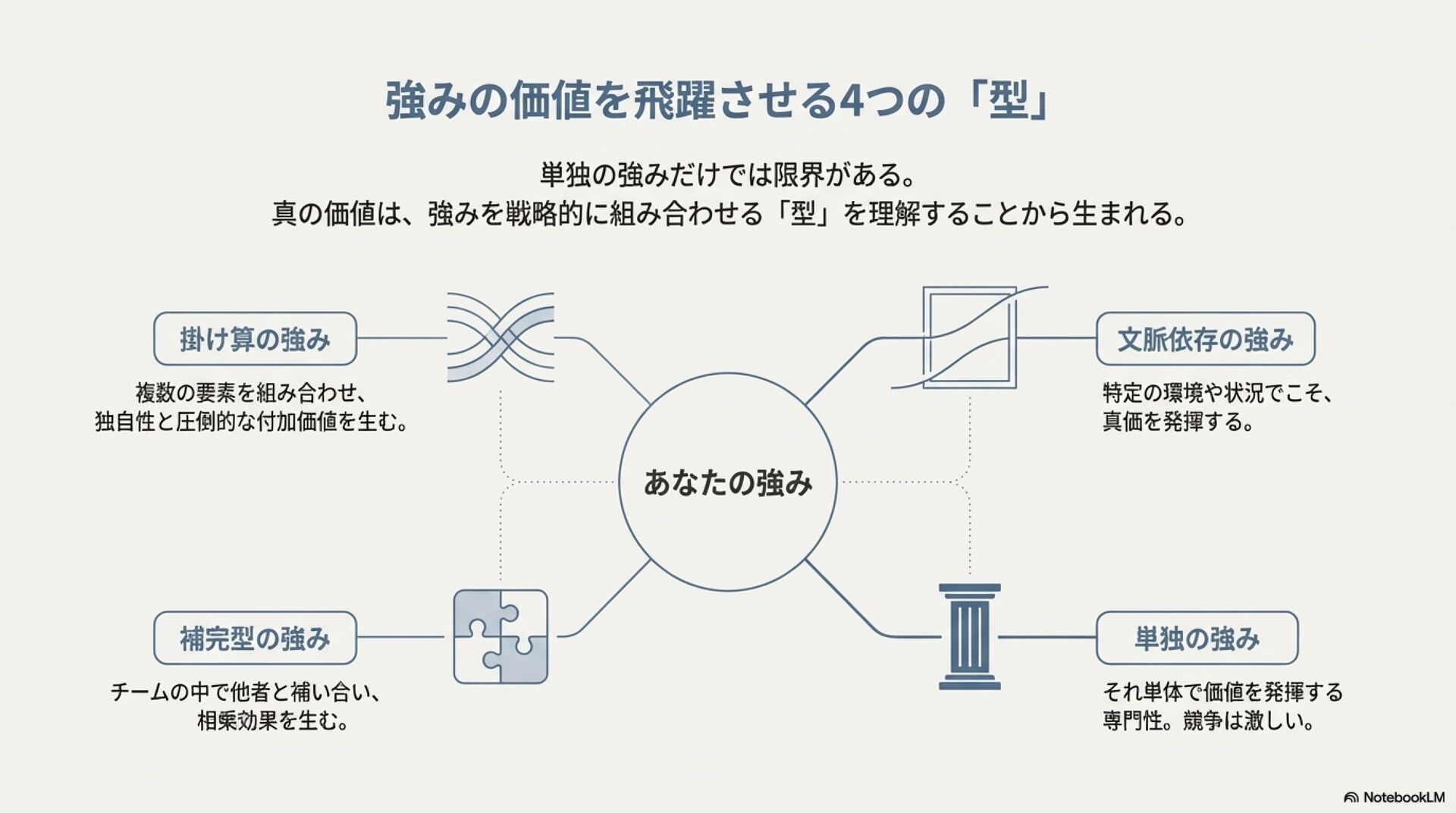 強みのデザイン入門 ZennBook ( https://zenn.dev/tbpgr/books/ee0950b3394ce0 )の内容を NotebookLM でスライドにしました。