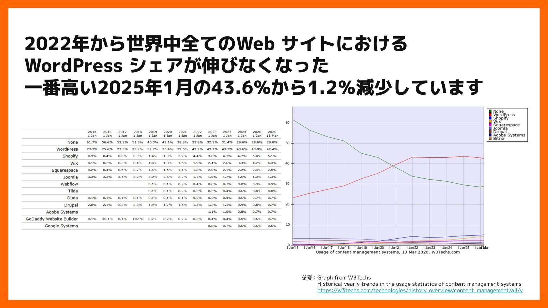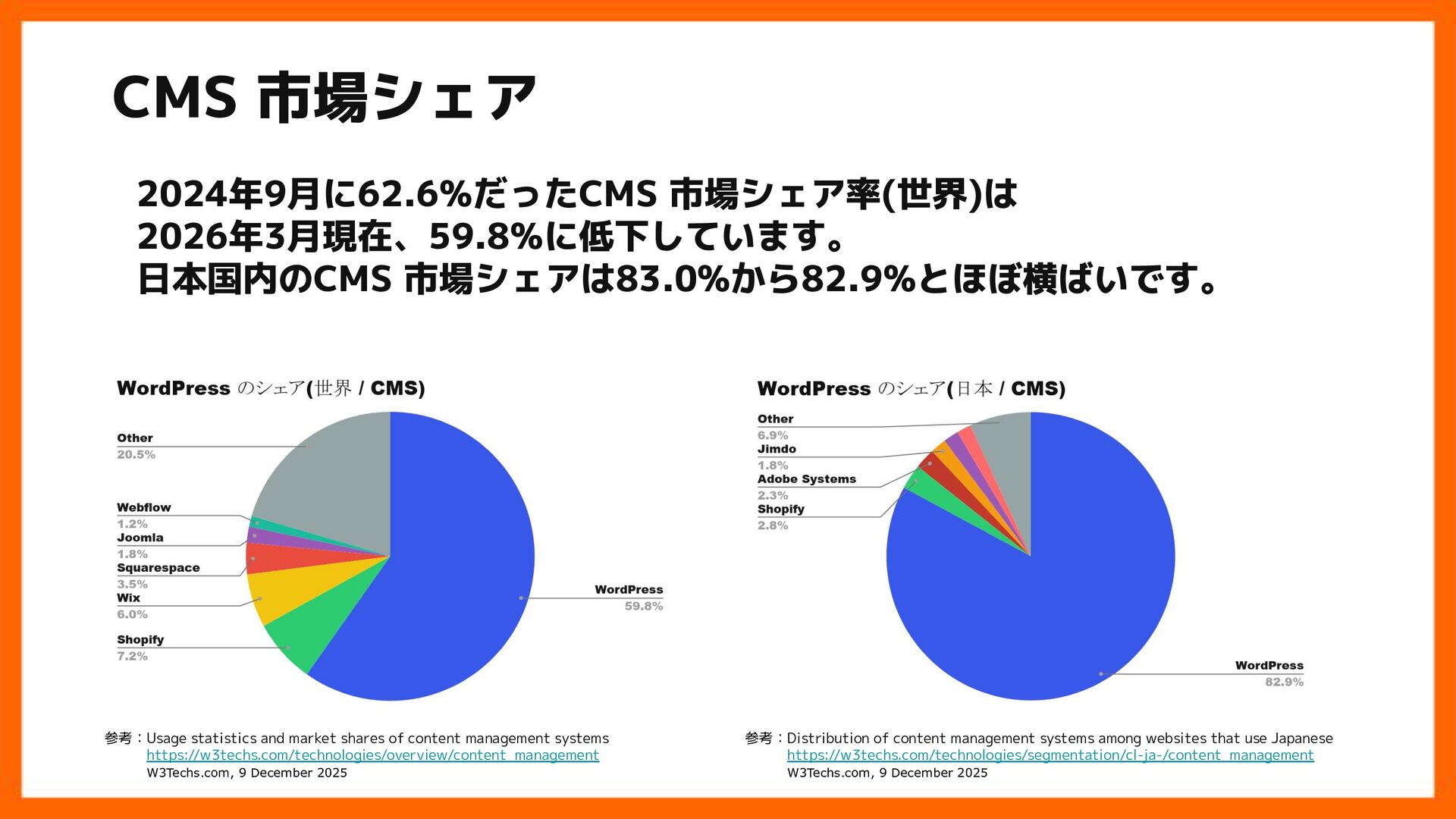 market shares of content management systems    https://w3techs.com/technologies/overview/content_management    W3Techs.com, 9 December 2025 参考:Distribution of content management systems among websites that use Japanese    https://w3techs.com/technologies/segmentation/cl-ja-/content_management    W3Techs.com, 9 December 2025