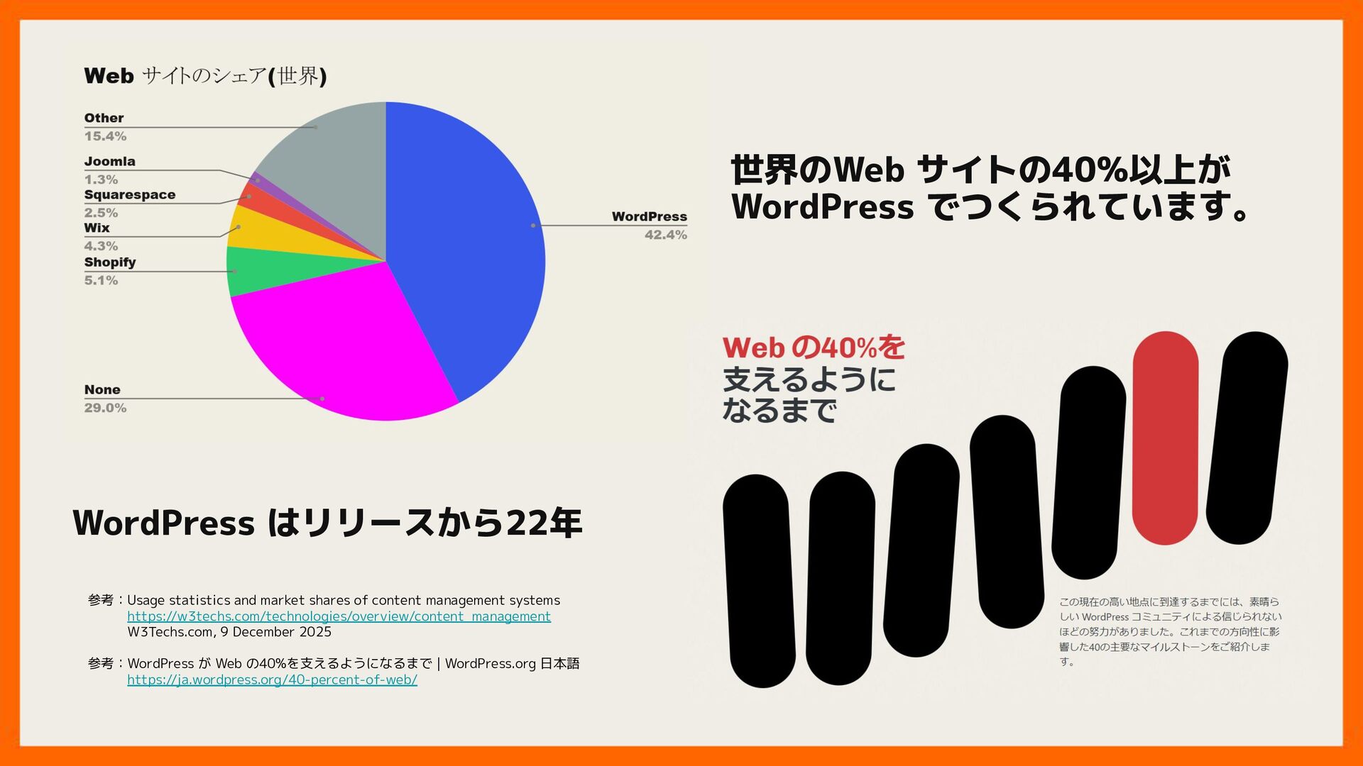 W3Techs.com, 9 December 2025 参考:WordPress が Web の40%を支えるようになるまで | WordPress.org 日本語    https://ja.wordpress.org/40-percent-of-web/ 世界のWeb サイトの40%以上が WordPress でつくられています。 WordPress はリリースから22年