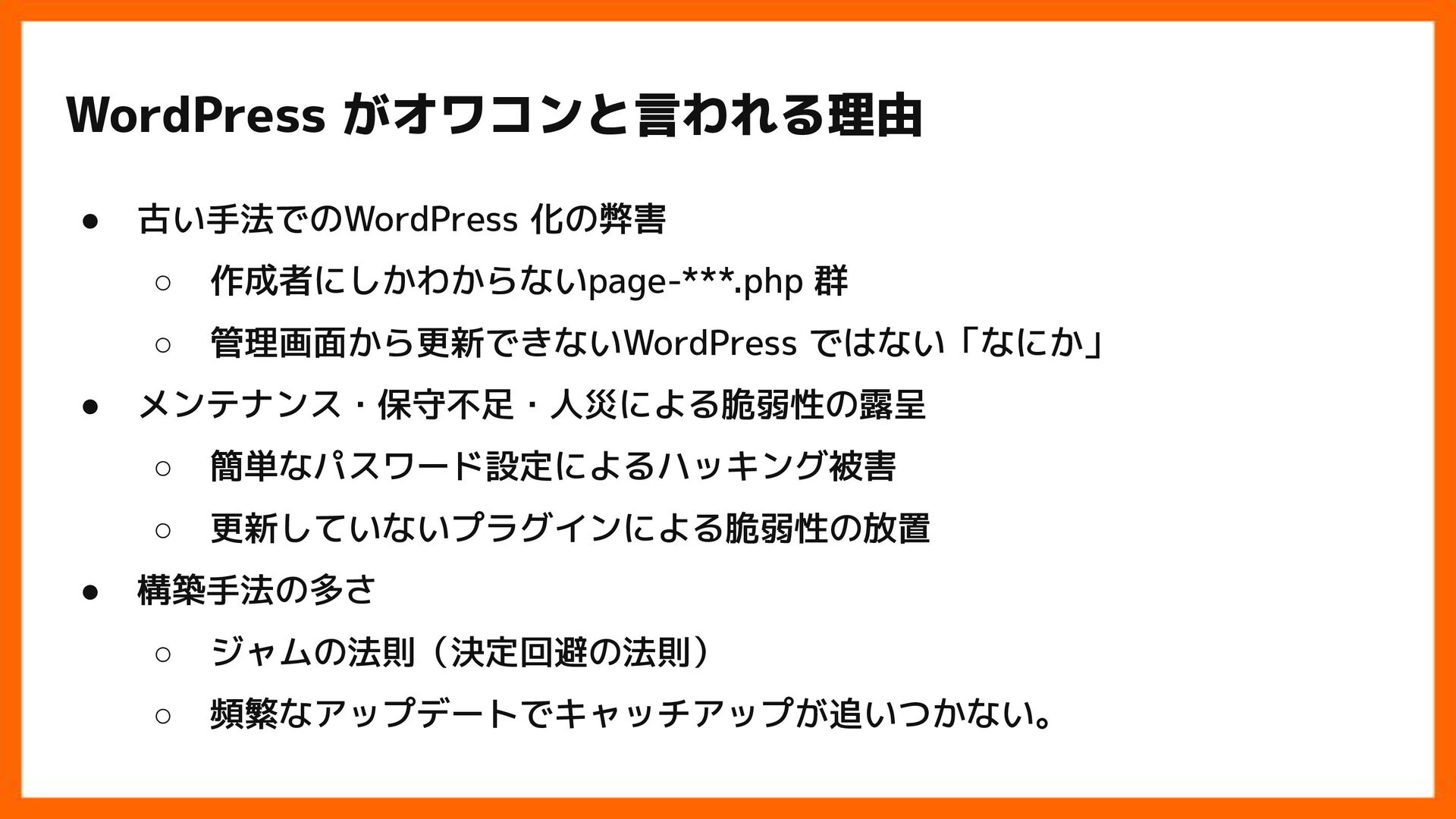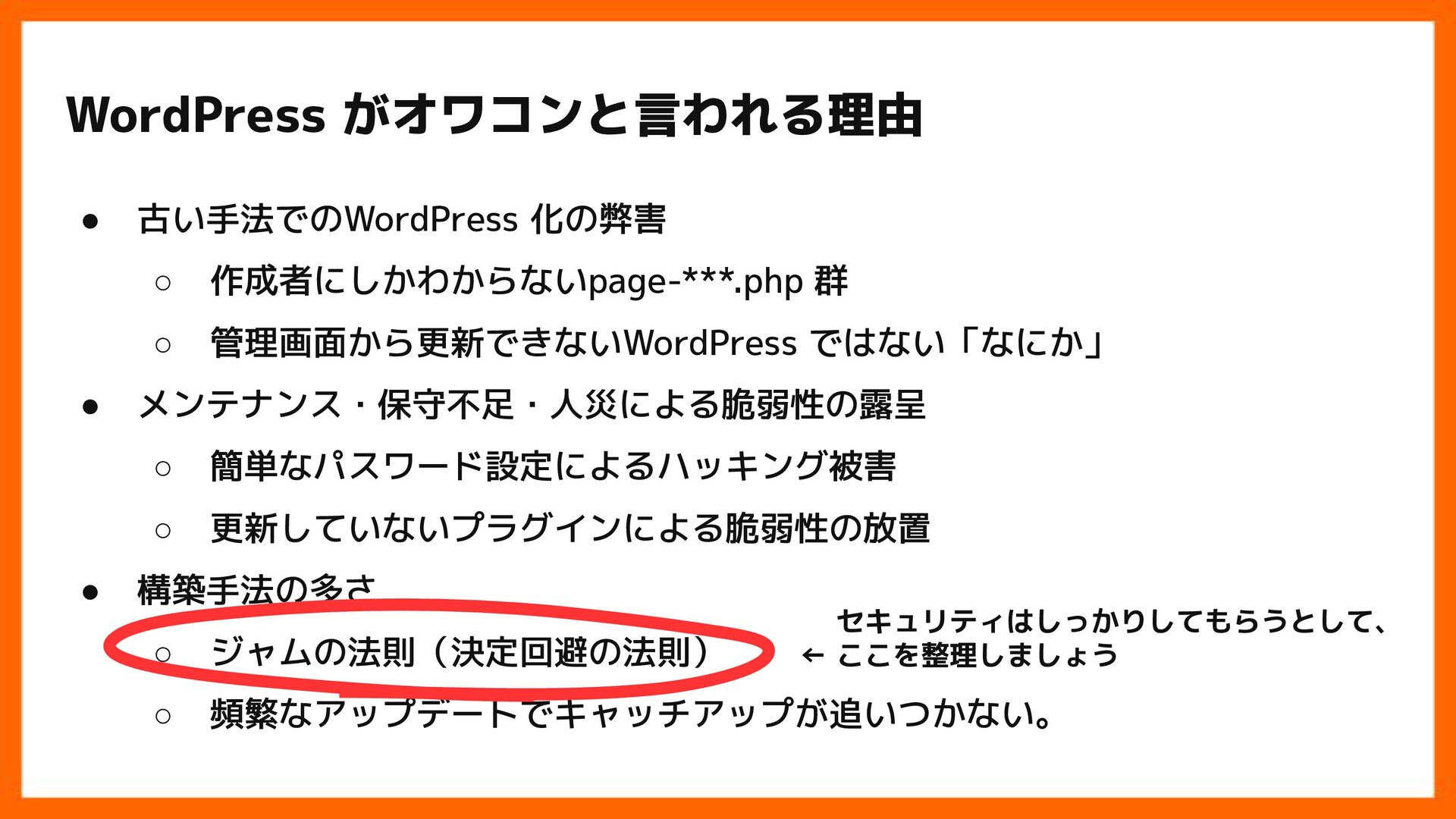 ではない「なにか」 • メンテナンス・保守不足・人災による脆弱性の露呈 ◦ 簡単なパスワード設定によるハッキング被害 ◦ 更新していないプラグインによる脆弱性の放置 • 構築手法の多さ ◦ ジャムの法則(決定回避の法則) ◦ 頻繁なアップデートでキャッチアップが追いつかない。   セキュリティはしっかりしてもらうとして、 ← ここを整理しましょう