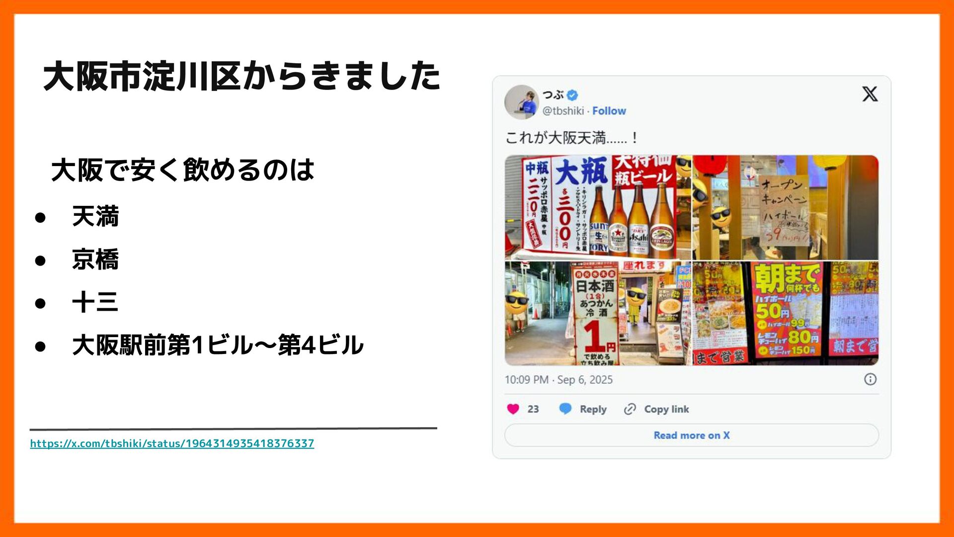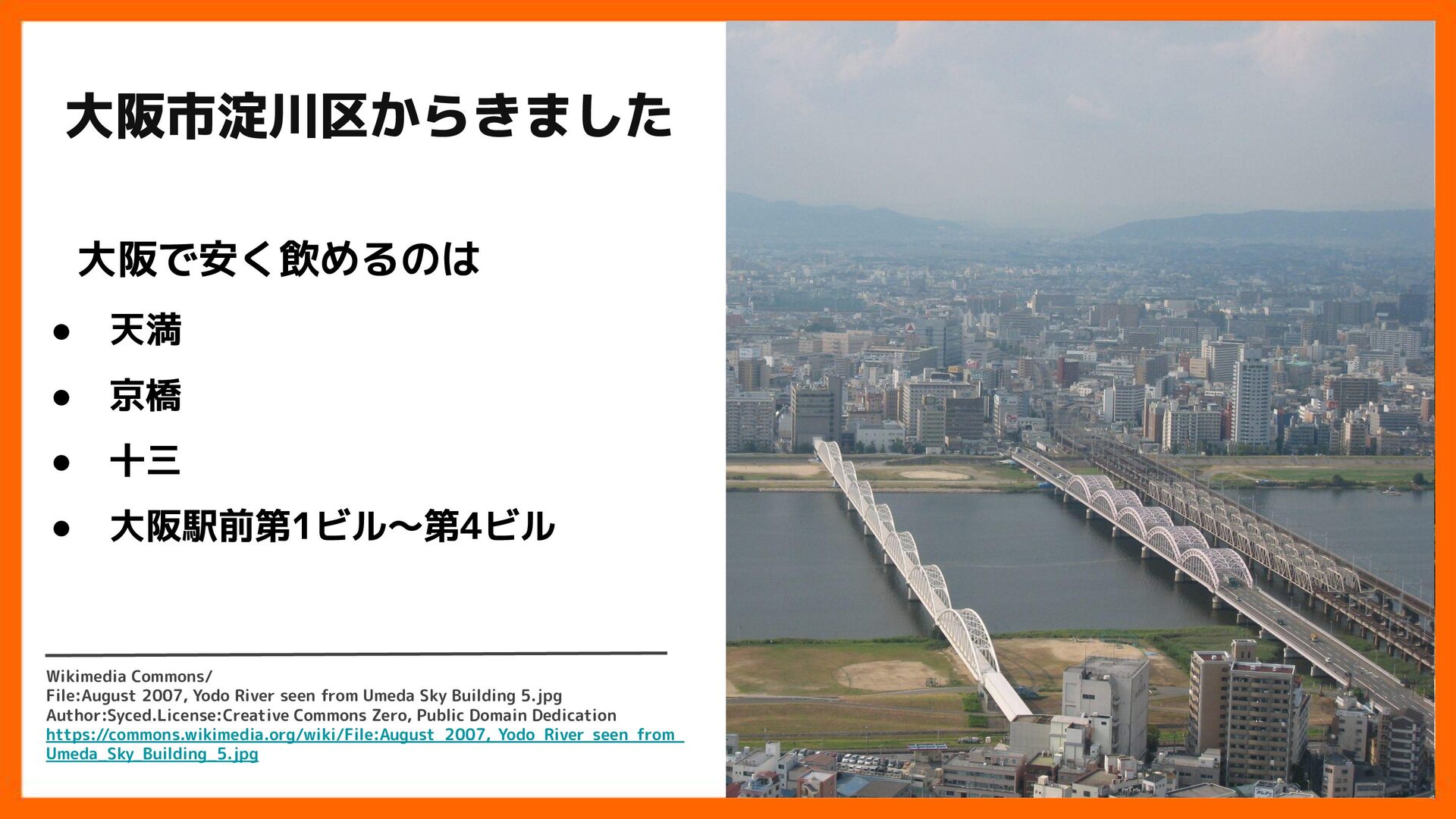1.  大阪で安く飲めるのは • 天満 • 京橋 • 十三 • 大阪駅前第1ビル~第4ビル Wikimedia