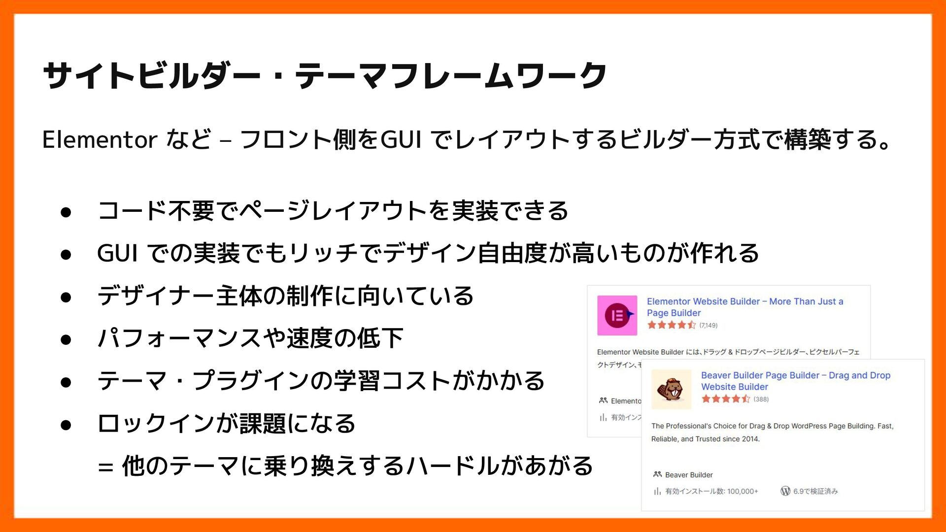 • テーマ・プラグインの学習コストがかかる • ロックインが課題になる = 他のテーマに乗り換えするハードルがあがる Elementor など – フロント側をGUI でレイアウトするビルダー方式で構築する。