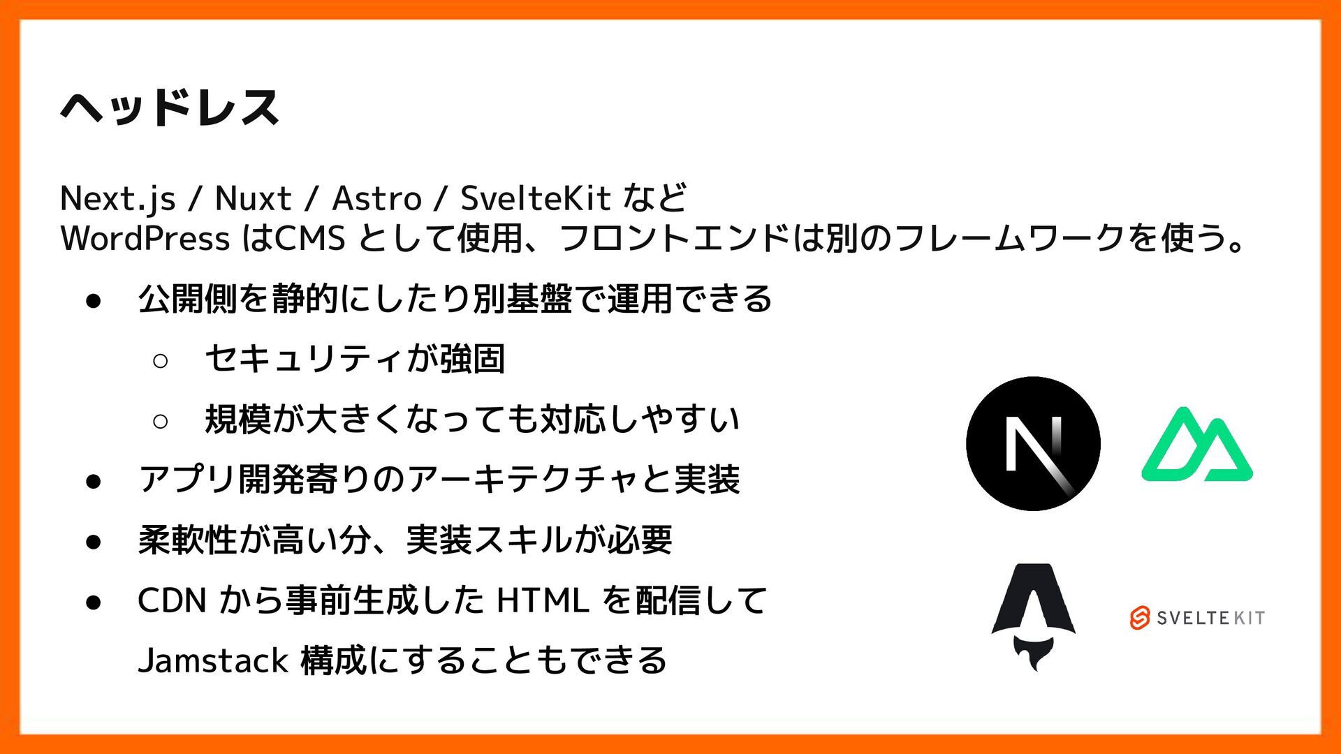 柔軟性が高い分、実装スキルが必要 • CDN から事前生成した HTML を配信して Jamstack 構成にすることもできる Next.js / Nuxt / Astro / SvelteKit など WordPress はCMS として使用、フロントエンドは別のフレームワークを使う。