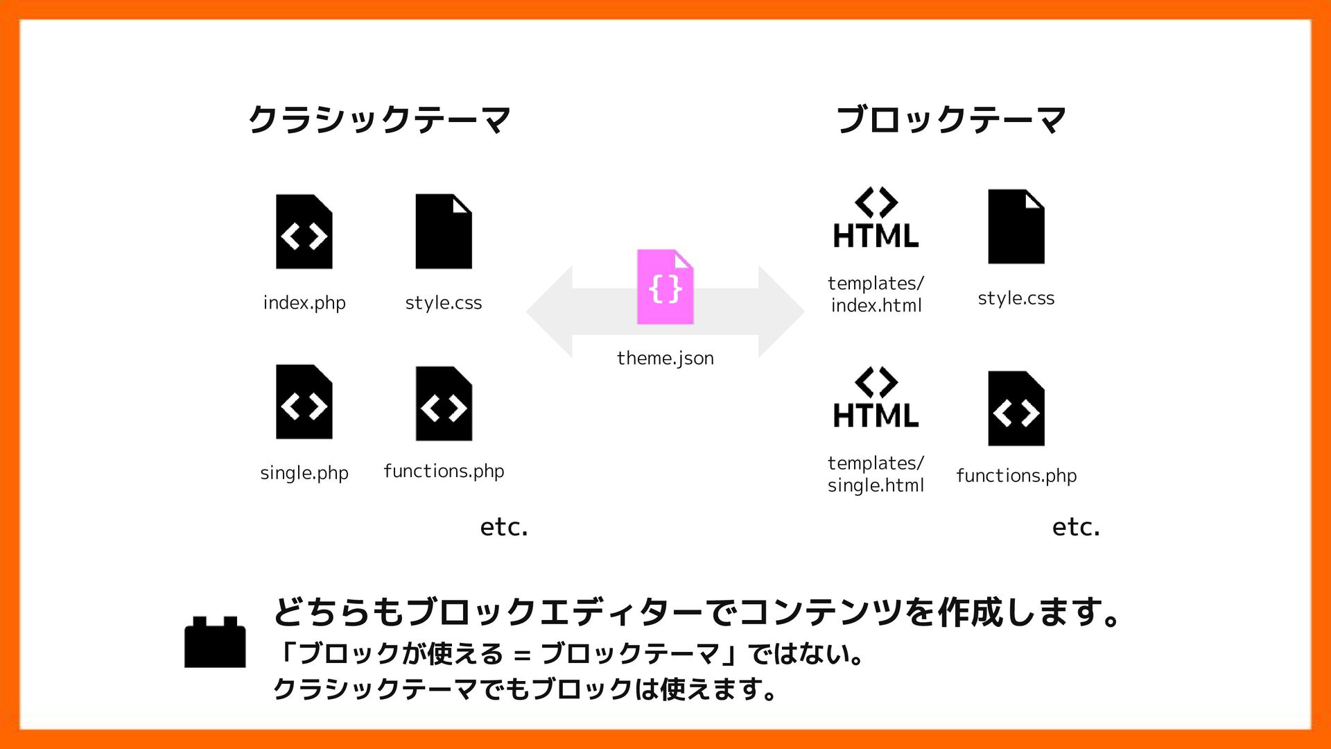 functions.php {} theme.json ブロックテーマ etc. etc. どちらもブロックエディターでコンテンツを作成します。 「ブロックが使える = ブロックテーマ」ではない。 クラシックテーマでもブロックは使えます。