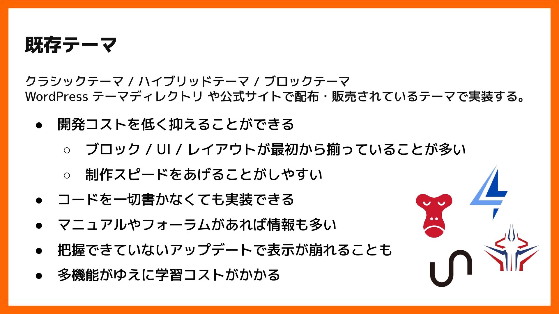 制作スピードをあげることがしやすい • コードを一切書かなくても実装できる • マニュアルやフォーラムがあれば情報も多い • 把握できていないアップデートで表示が崩れることも • 多機能がゆえに学習コストがかかる クラシックテーマ / ハイブリッドテーマ / ブロックテーマ WordPress テーマディレクトリ や公式サイトで配布・販売されているテーマで実装する。