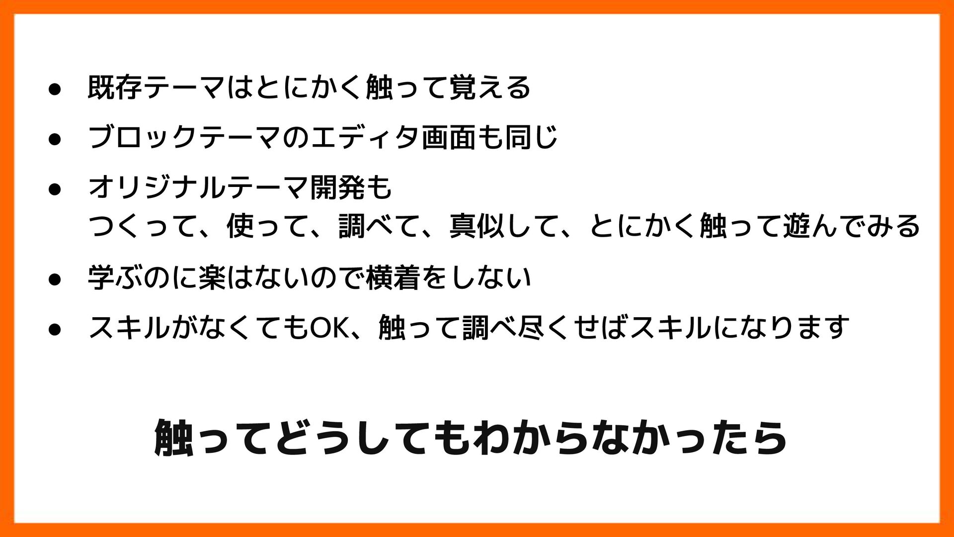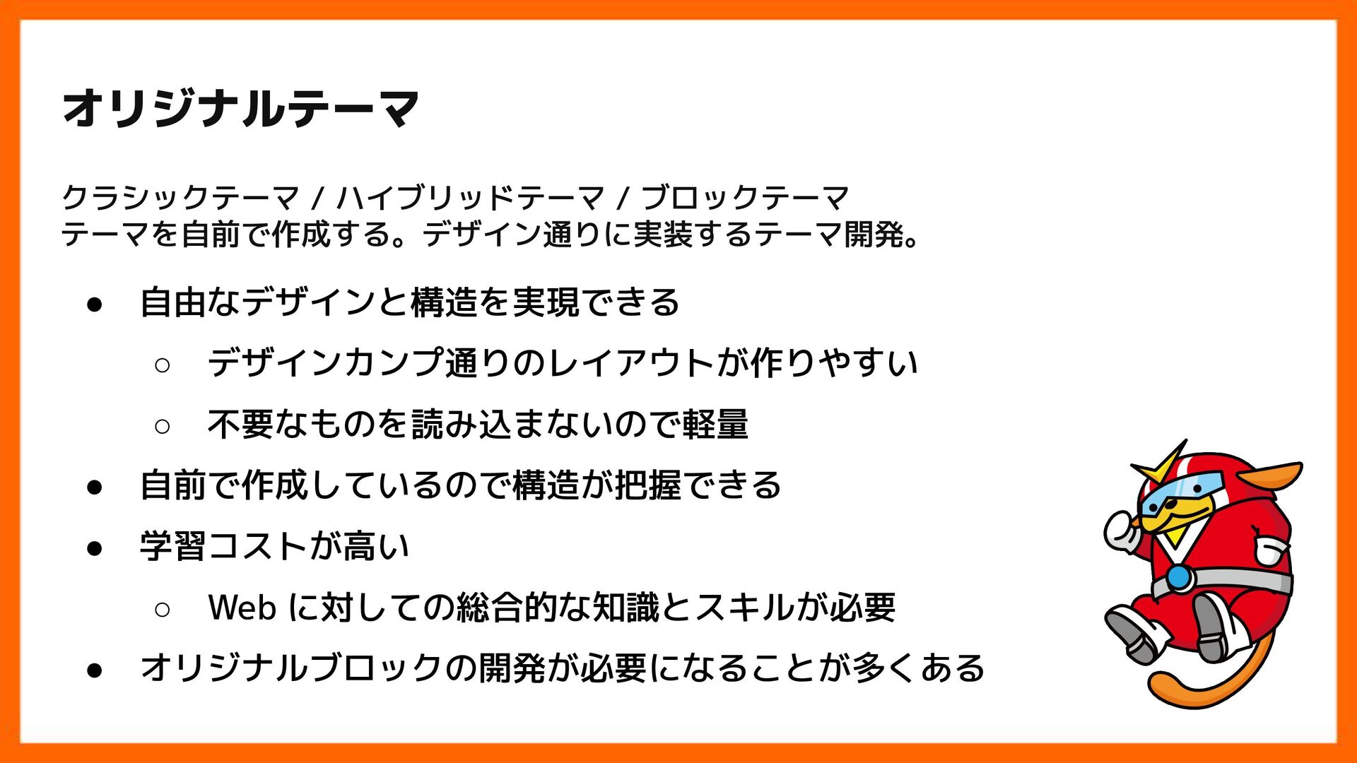 学習コストが高い ◦ Web に対しての総合的な知識とスキルが必要 • オリジナルブロックの開発が必要になることが多くある クラシックテーマ / ハイブリッドテーマ / ブロックテーマ テーマを自前で作成する。デザイン通りに実装するテーマ開発。