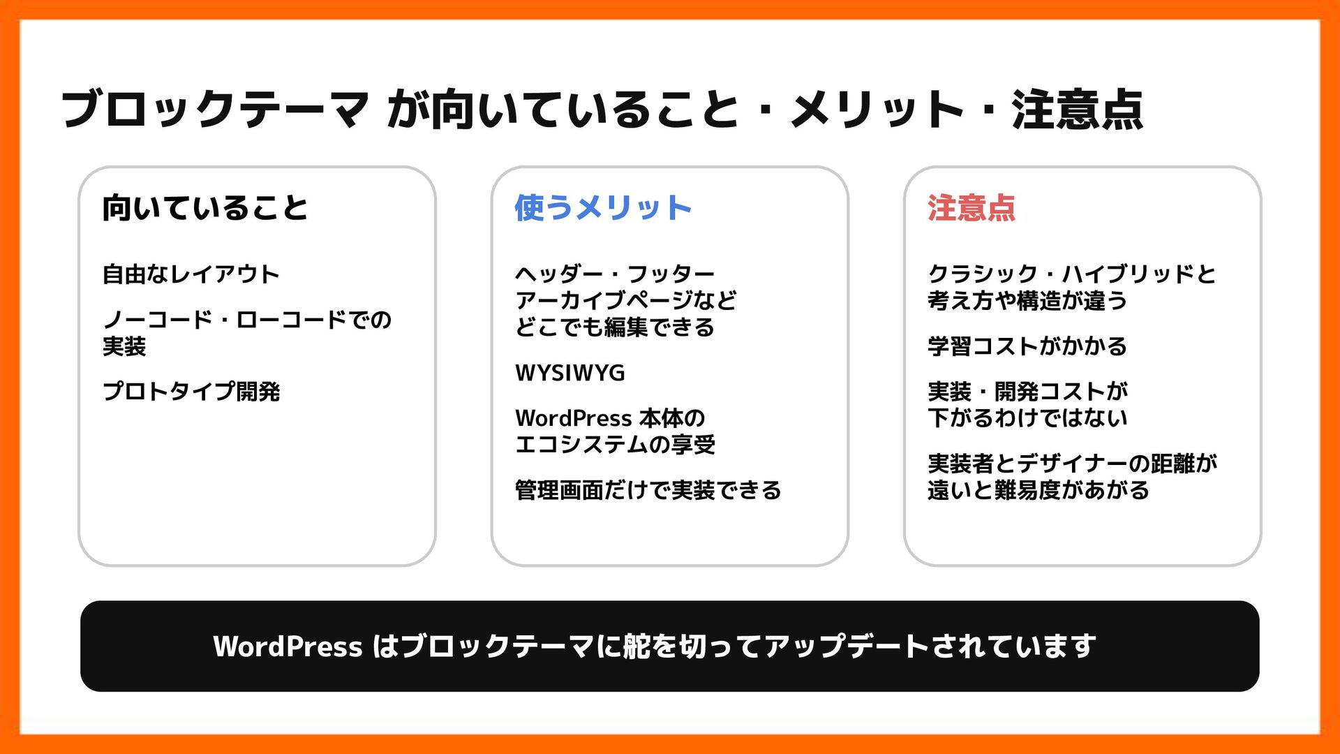 WordPress 本体の エコシステムの享受 管理画面だけで実装できる 注意点 クラシック・ハイブリッドと 考え方や構造が違う 学習コストがかかる 実装・開発コストが 下がるわけではない 実装者とデザイナーの距離が 遠いと難易度があがる WordPress はブロックテーマに舵を切ってアップデートされています ブロックテーマ が向いていること・メリット・注意点