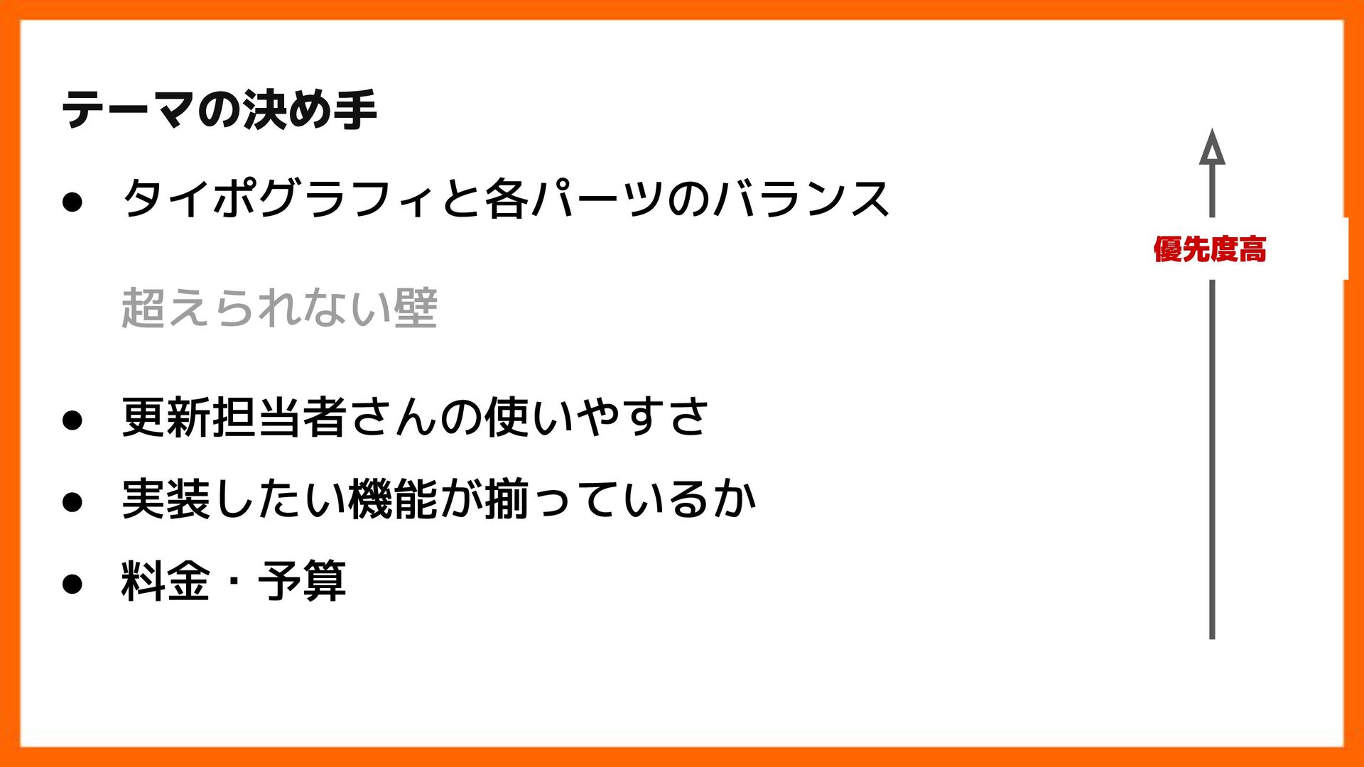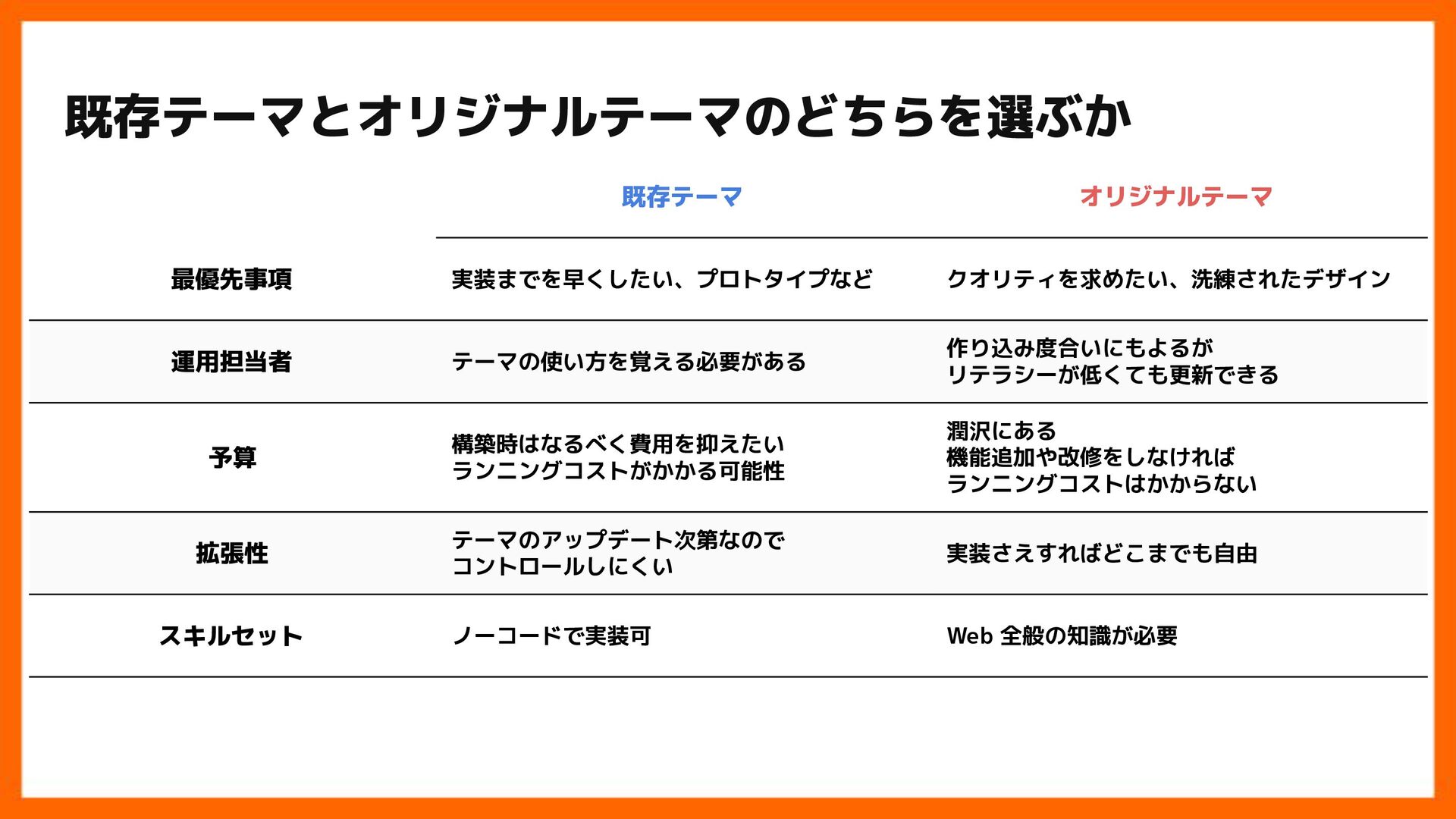 予算 構築時はなるべく費用を抑えたい ランニングコストがかかる可能性 潤沢にある 機能追加や改修をしなければ ランニングコストはかからない 拡張性 テーマのアップデート次第なので コントロールしにくい 実装さえすればどこまでも自由 スキルセット ノーコードで実装可 Web 全般の知識が必要