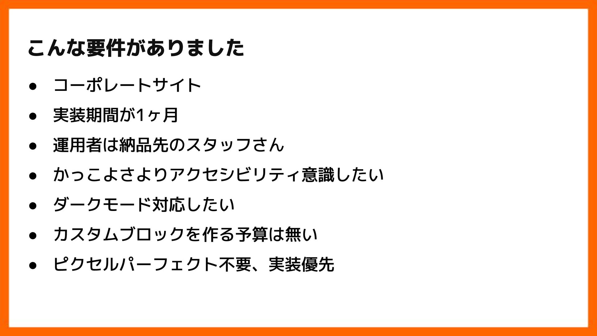 16. • コーポレートサイト • 実装期間が1ヶ月 • 運用者は納品先のスタッフさん • かっこよさよりアクセシビリティ意識したい • ダークモード対応したい