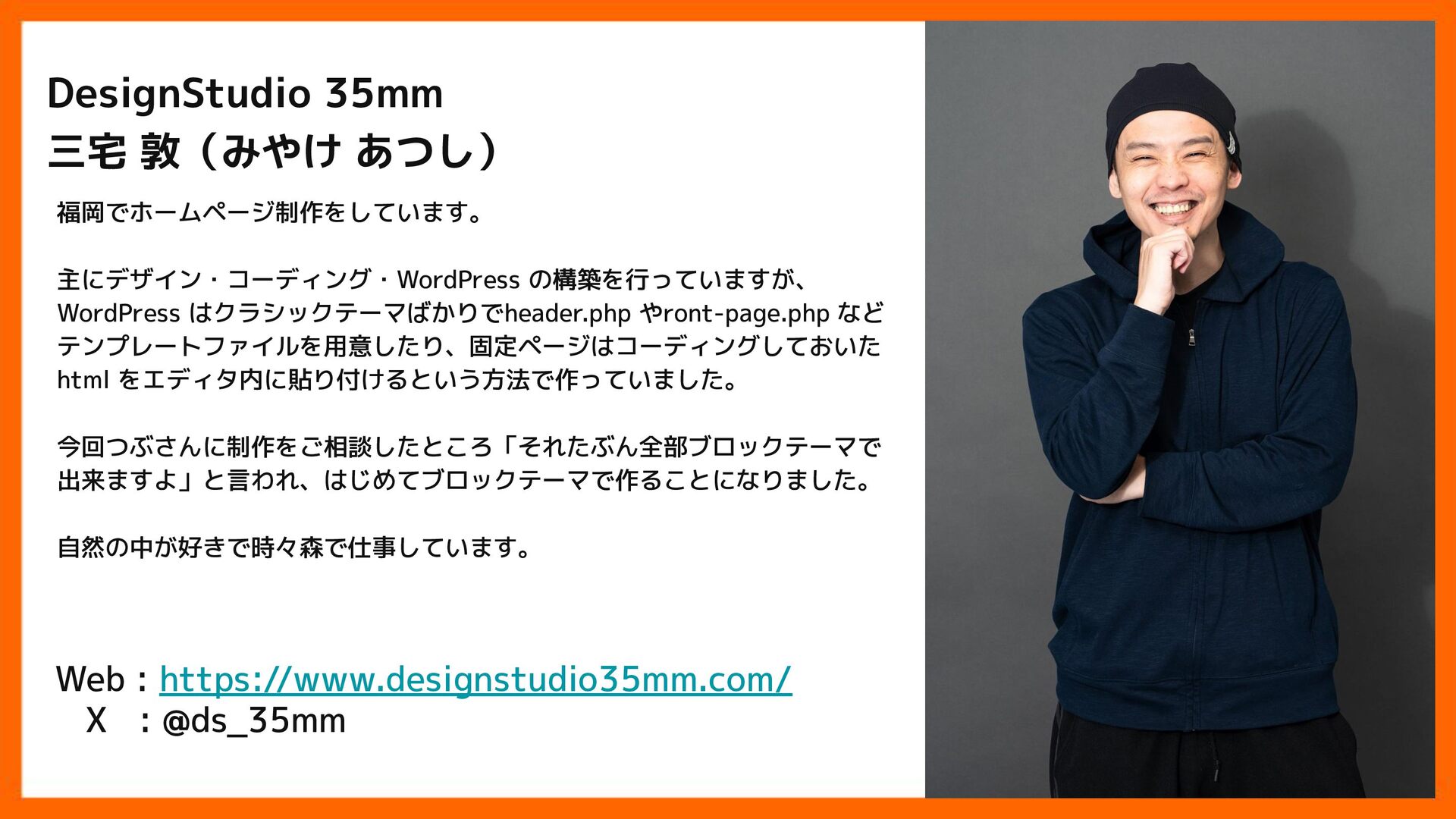 やront-page.php など テンプレートファイルを用意したり、固定ページはコーディングしておいた html をエディタ内に貼り付けるという方法で作っていました。 今回つぶさんに制作をご相談したところ「それたぶん全部ブロックテーマで 出来ますよ」と言われ、はじめてブロックテーマで作ることになりました。 自然の中が好きで時々森で仕事しています。 Web : https://www.designstudio35mm.com/ X : @ds_35mm