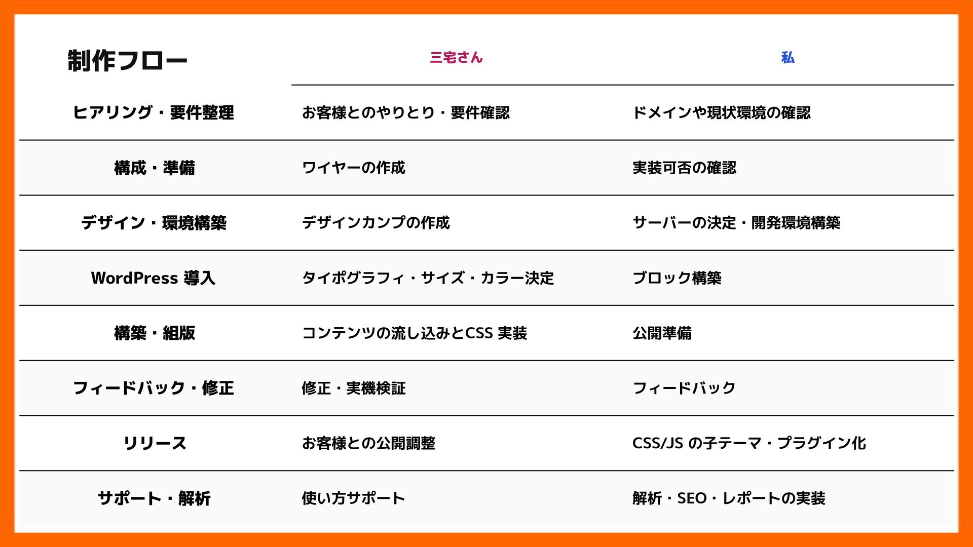 デザインカンプの作成 サーバーの決定・開発環境構築 WordPress 導入 タイポグラフィ・サイズ・カラー決定 ブロック構築 構築・組版 コンテンツの流し込みとCSS 実装 公開準備 フィードバック・修正 修正・実機検証 フィードバック リリース お客様との公開調整 CSS/JS の子テーマ・プラグイン化 サポート・解析 使い方サポート 解析・SEO・レポートの実装