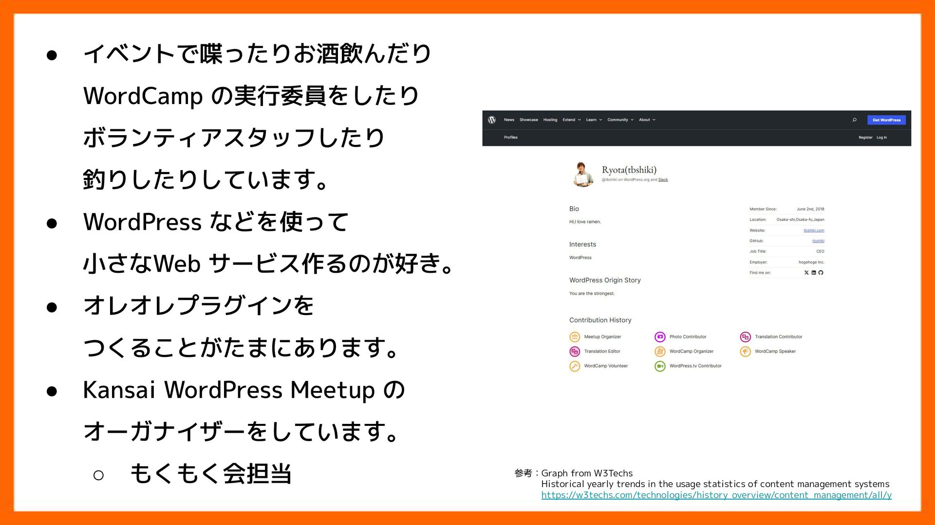 サービス作るのが好き。 • オレオレプラグインを つくることがたまにあります。 • Kansai WordPress Meetup の オーガナイザーをしています。 ◦ もくもく会担当 参考:Graph from W3Techs    Historical yearly trends in the usage statistics of content management systems    https://w3techs.com/technologies/history_overview/content_management/all/y