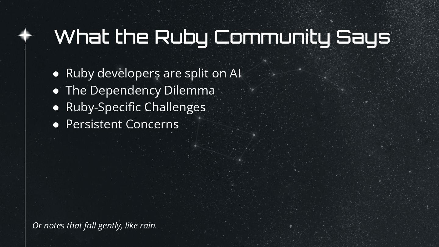 on AI • The Dependency Dilemma • Ruby-Specific Challenges • Persistent Concerns Or notes that fall gently, like rain.