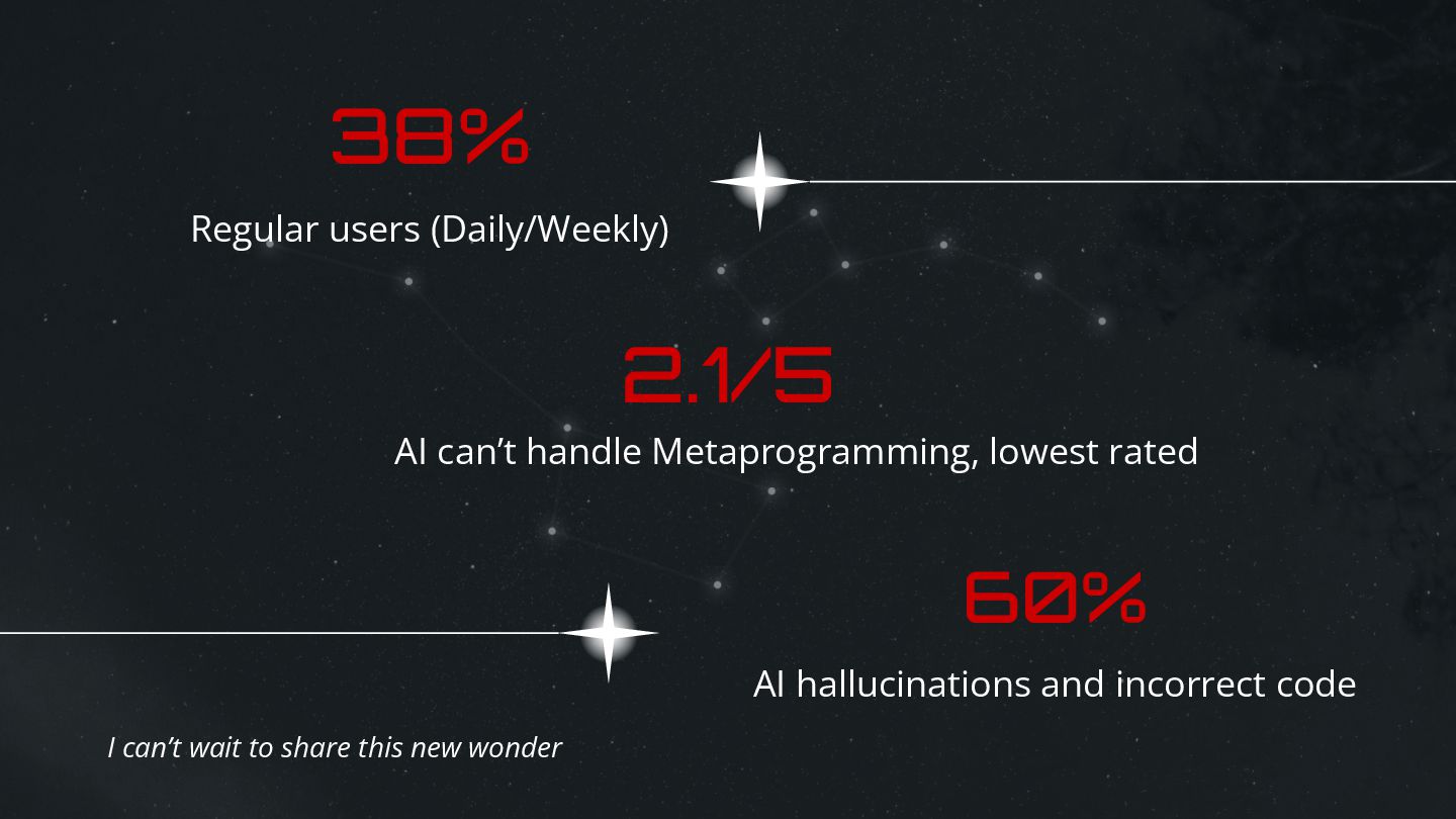 6. Regular users (Daily/Weekly) 38% 2.1/5 AI can’t handle Metaprogramming, lowest