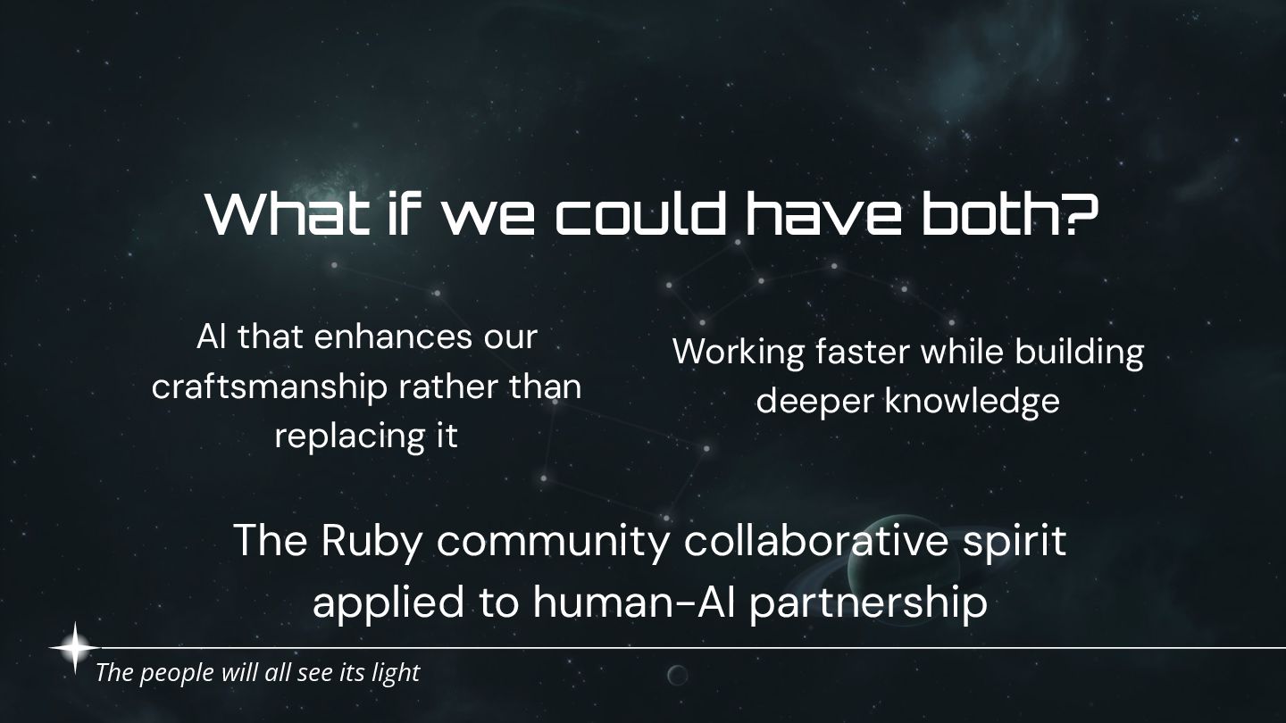 deeper knowledge AI that enhances our craftsmanship rather than replacing it The Ruby community collaborative spirit applied to human-AI partnership The people will all see its light