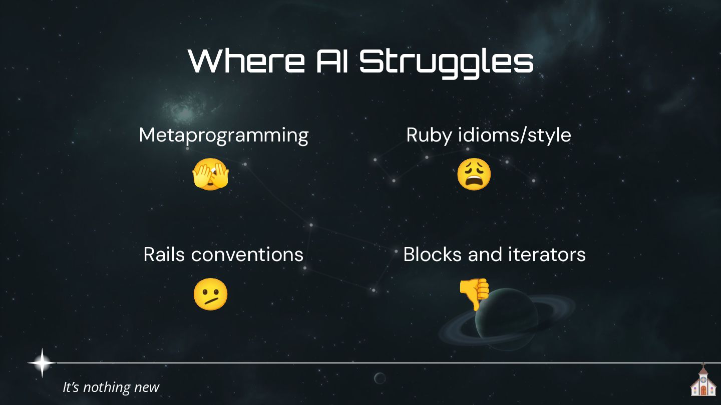 11. Where AI Struggles 🫣 😩 🫤 👎 Metaprogramming Ruby idioms/style